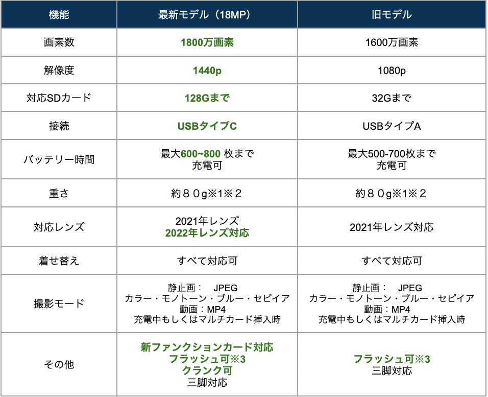 1,800万画素と高スペック、写真は600枚以上撮影可能、USB-TypeC対応。