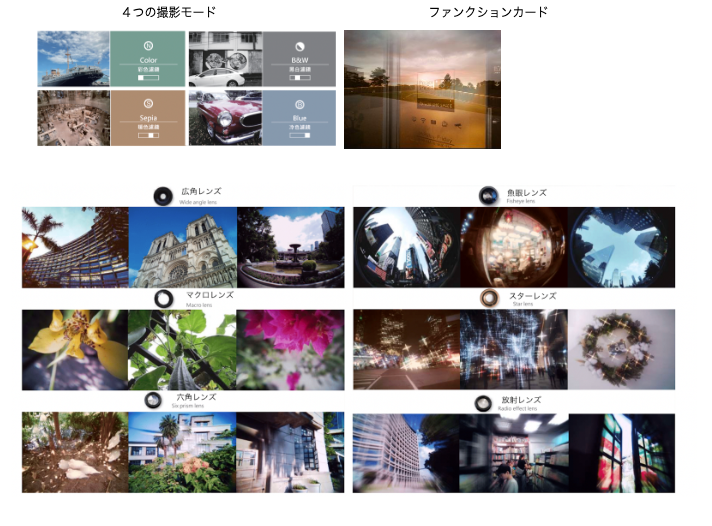 1) 厳選された4つの撮影モードで雰囲気が自由自在(カラー、モノクロ、セピア、ブルー)