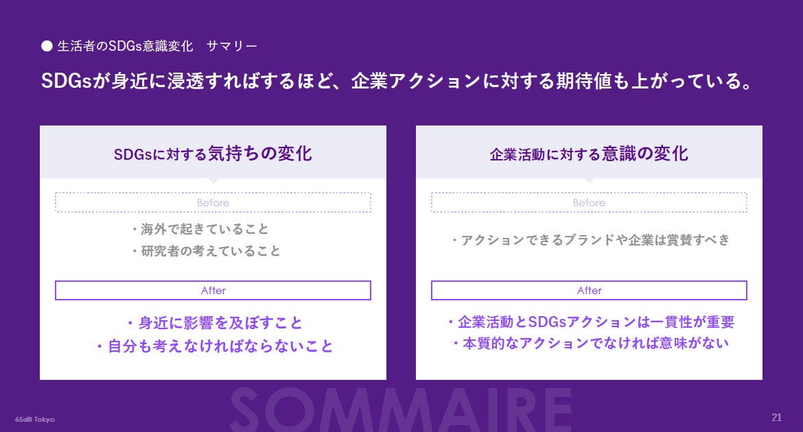 今後も65dBならではのメソッドを用いて、企業のニーズにあわせた様々な問題に関する生活者の生の声を分析し、SDGs施策を検討されるプロジェクト担当者や市場の動きをより深く見極めたいマーケターに向けて、企業のSDGsアクションを加速させるための新たな視点をご提供していく予定です。