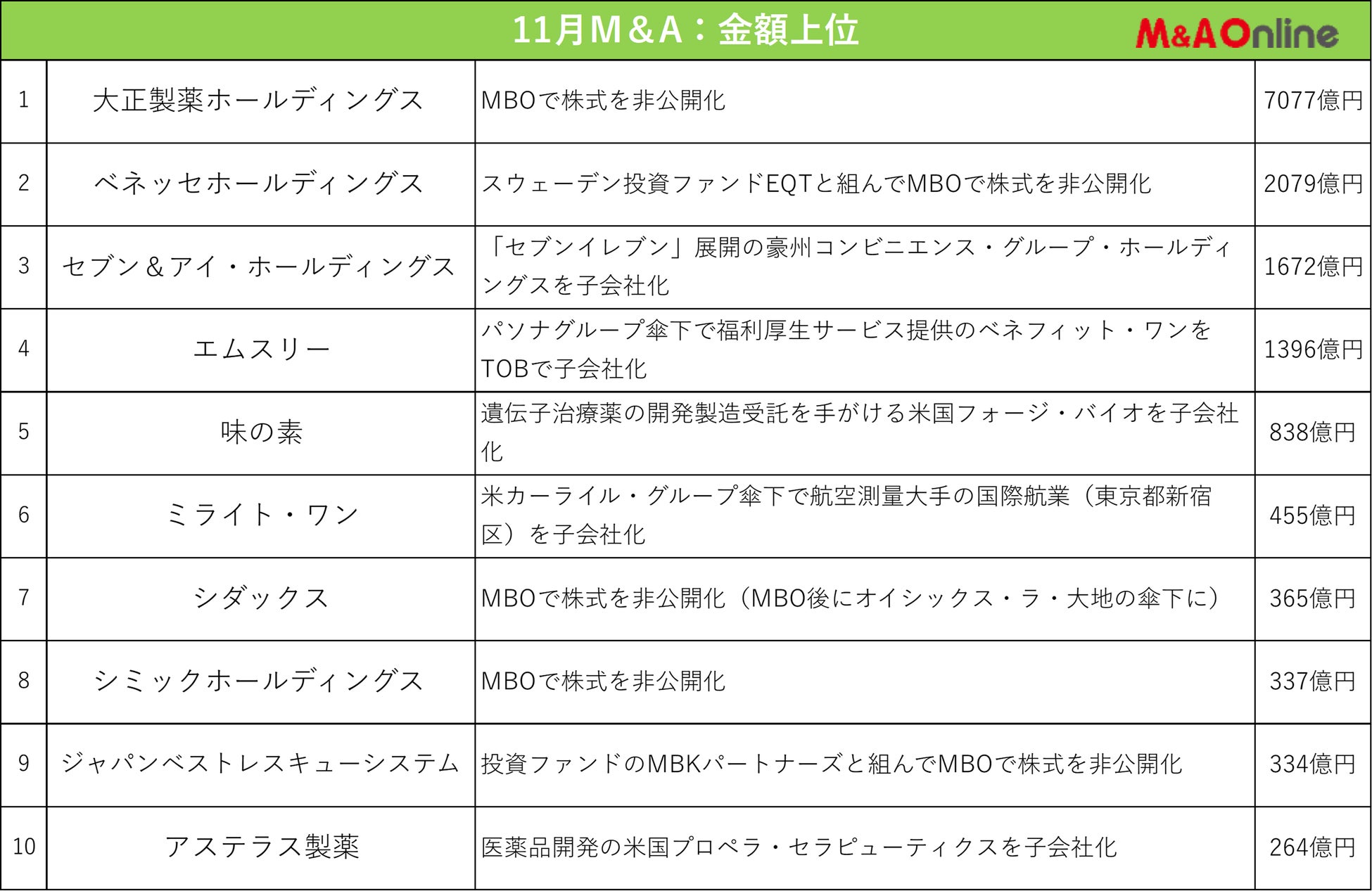 11月の金額首位は大正製薬ホールディングスのMBO。オーナー家が設立した買収目的会社がTOBを行い、株式を非公開化します。買付代金は最大7077億円で、MBOを目的としたTOBで過去最大です。