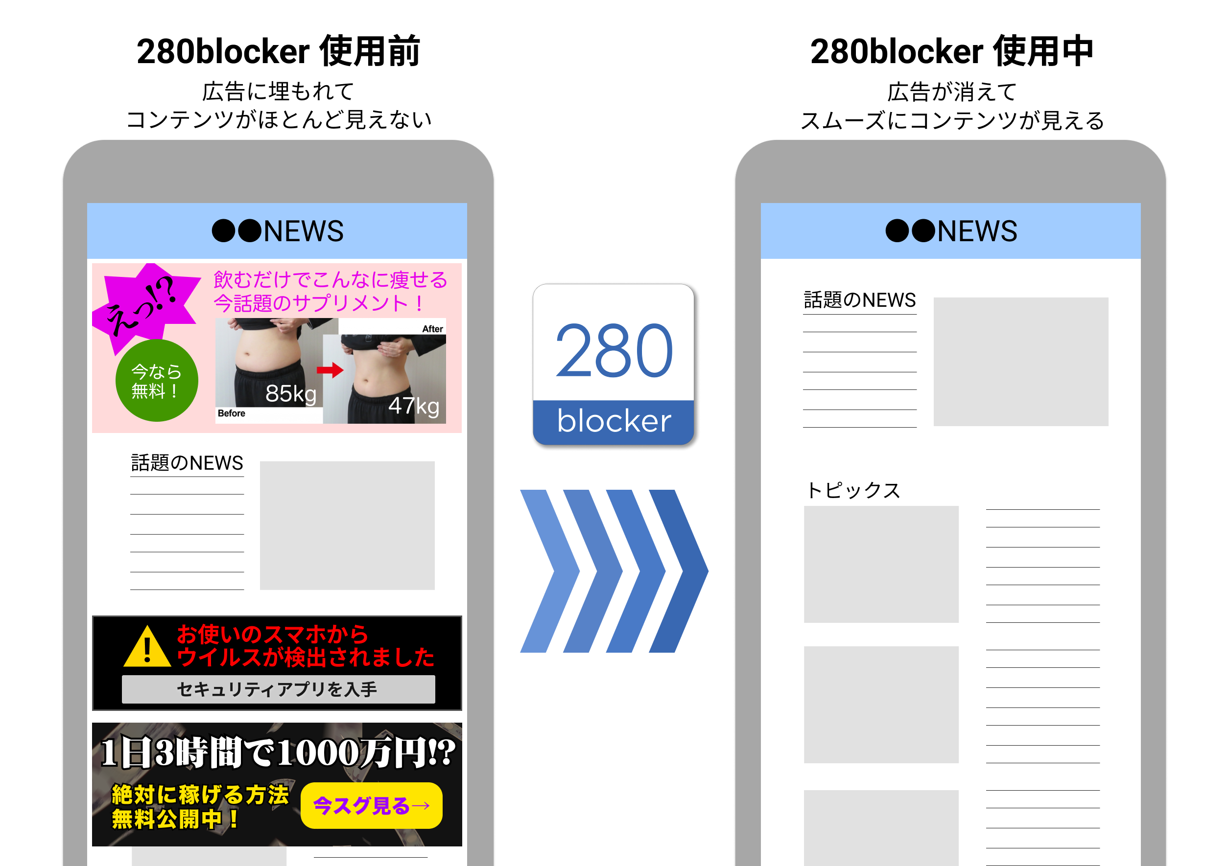 また、インターネット上には誇大広告や虚偽広告(フェイク広告)、詐欺サイト等に誘導する悪質な広告等が含まれている場合があり、これらは水面化で発生する迷惑行為「グレーゾーン犯罪」の温床になっています。「280blocker」は、悪質な広告の誤タップを防ぐ防犯ツールとしてもご活用いただけます。