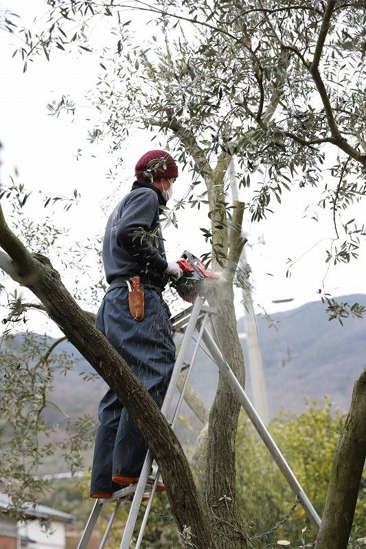 今年、当園のオリーブは豊作で、新しく生えた力強い枝に立派な果実が鈴なりに実り、美しい果実が多く収穫できています。これは2年前から行ったオリーブの「強剪定(きょうせんてい)」が功を奏した結果です。