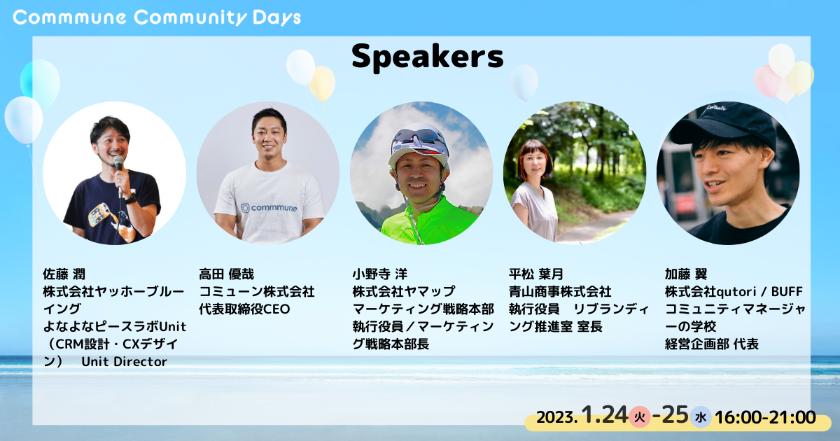 コミューン株式会社(本社:東京都品川区、代表取締役CEO:高田優哉)は、2023年1月24日(火)・25日(水)にコミュニティに関わる全ての方に向けた無料オンラインカンファレンス「Commmune Community Days 〜コミュニティにまつわる『あれこれ』を360°語り尽くす〜」を開催することをお知らせします。各業界のキーパーソンを招聘し、完全無料で開催させていただきます。また、参加者限定のオフライン交流会も後日実施しますので、皆様お誘い合わせの上ご参加をお待ちしております。