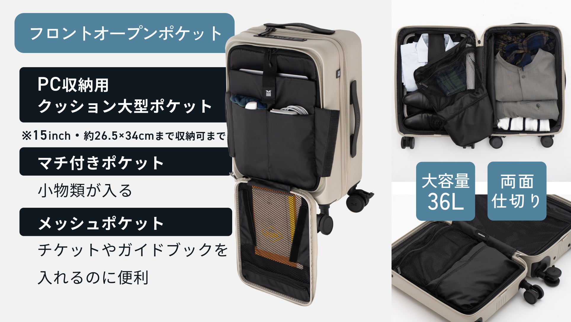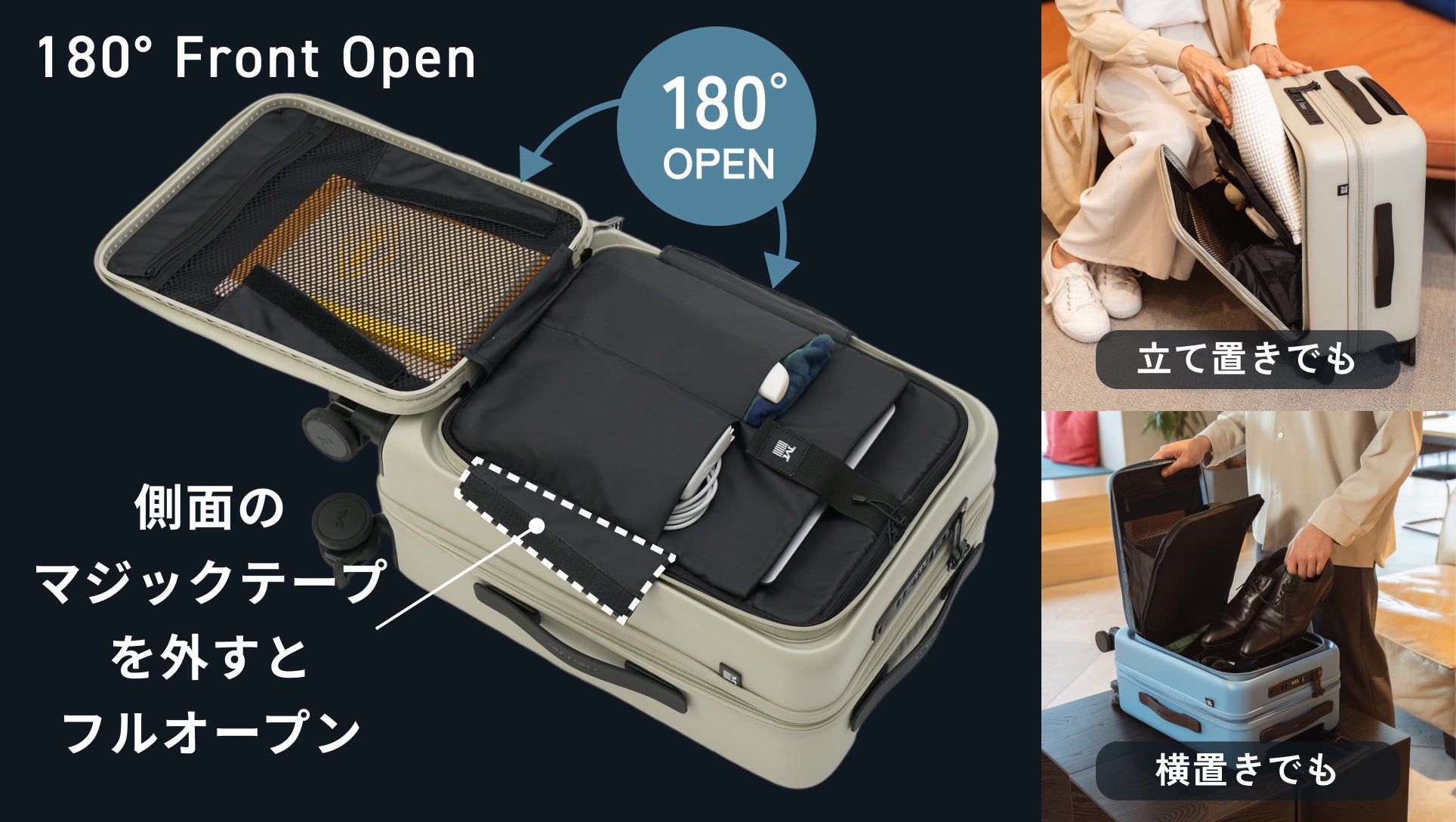 フロントオープンポケットを搭載したことで、スーツケースを立てたまま荷物を取り出し可能。マジックテープを外すと180°大きく開くフルオープン仕様になり、狭い場所でも快適にパッキングしていただけます。