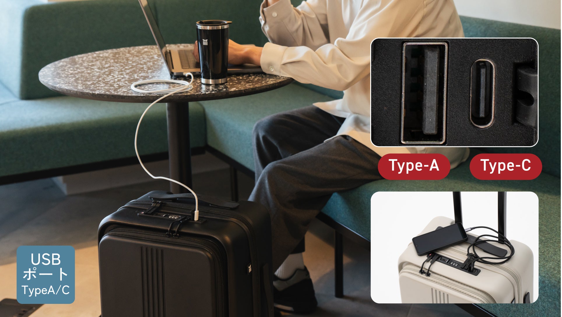 モバイルバッテリーを収納すれば、スーツケースから電源を取れる仕様です。使いやすさを考え、USBポートは天面に設置。Type-A、Type-Cの2つのポートを搭載しているので、スマホもPCも同時に充電できます。