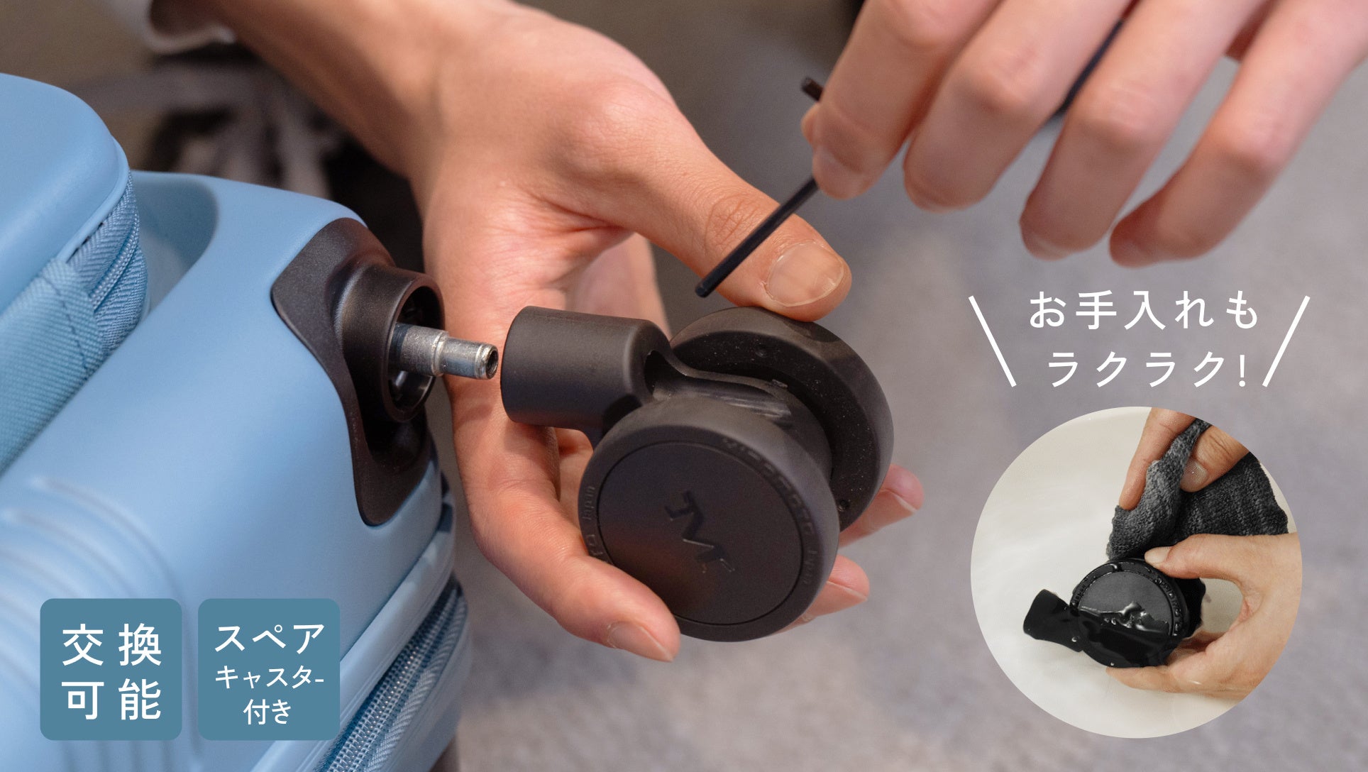 MAIMOのスーツケースは付属の六角レンチで簡単にキャスター交換可能。キャスターの故障でスーツケースを買い替える必要がなく、長く快適にお使いいただけます。新発売のSTAND UPにはスペアキャスターが1個付属するため急なトラブルでも安心です!