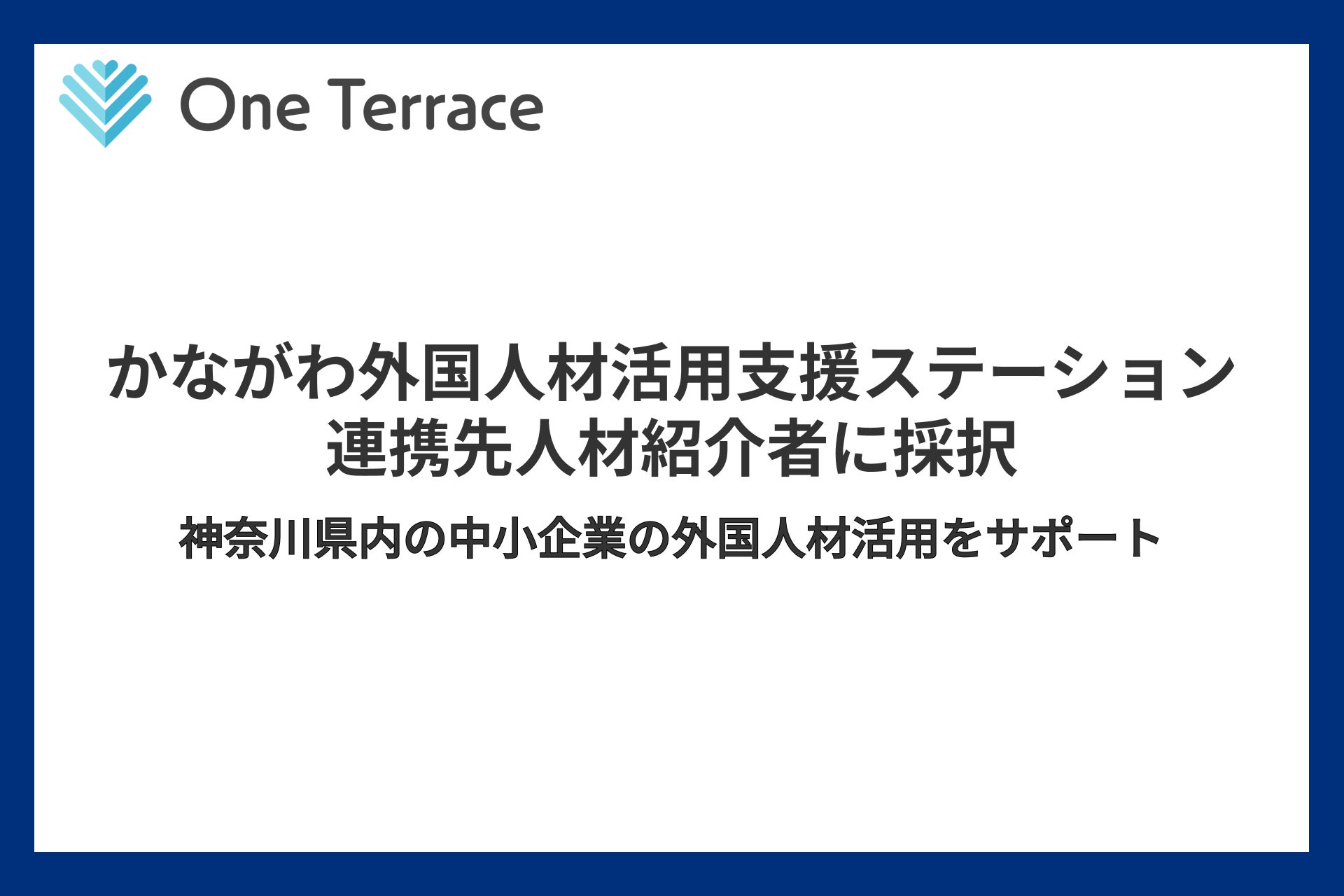 株式会社One Terrace(本社:東京都港区、代表取締役:石中達也)はこのたび、公益財団法人神奈川産業振興センター(KIP)が運営する「かながわ外国人材活用支援ステーション」の連携先人材紹介者に採択されましたので、お知らせいたします。