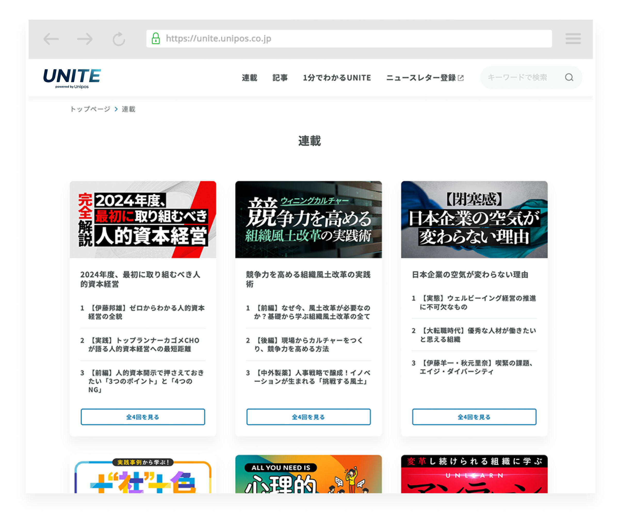 新メディアUNITEは、一時的な情報提供だけではなく、経営・組織の改革に取り組む皆様が「経営・組織に行き詰まりを感じたとき」「カルチャーに課題を抱いたとき」「売上・業績の低下に悩みを感じたとき」何度も振り返り、学びを深めることができる情報の蓄積場としてリリースいたしました。一長一短ではいかない組織づくりの専門的知見や実践術についても一本一本有益な情報としてじっくり触れていただき学びを深めることができます。組織変革を促進する一助となるため、少しでも役立つ記事や情報を公開してまいります。