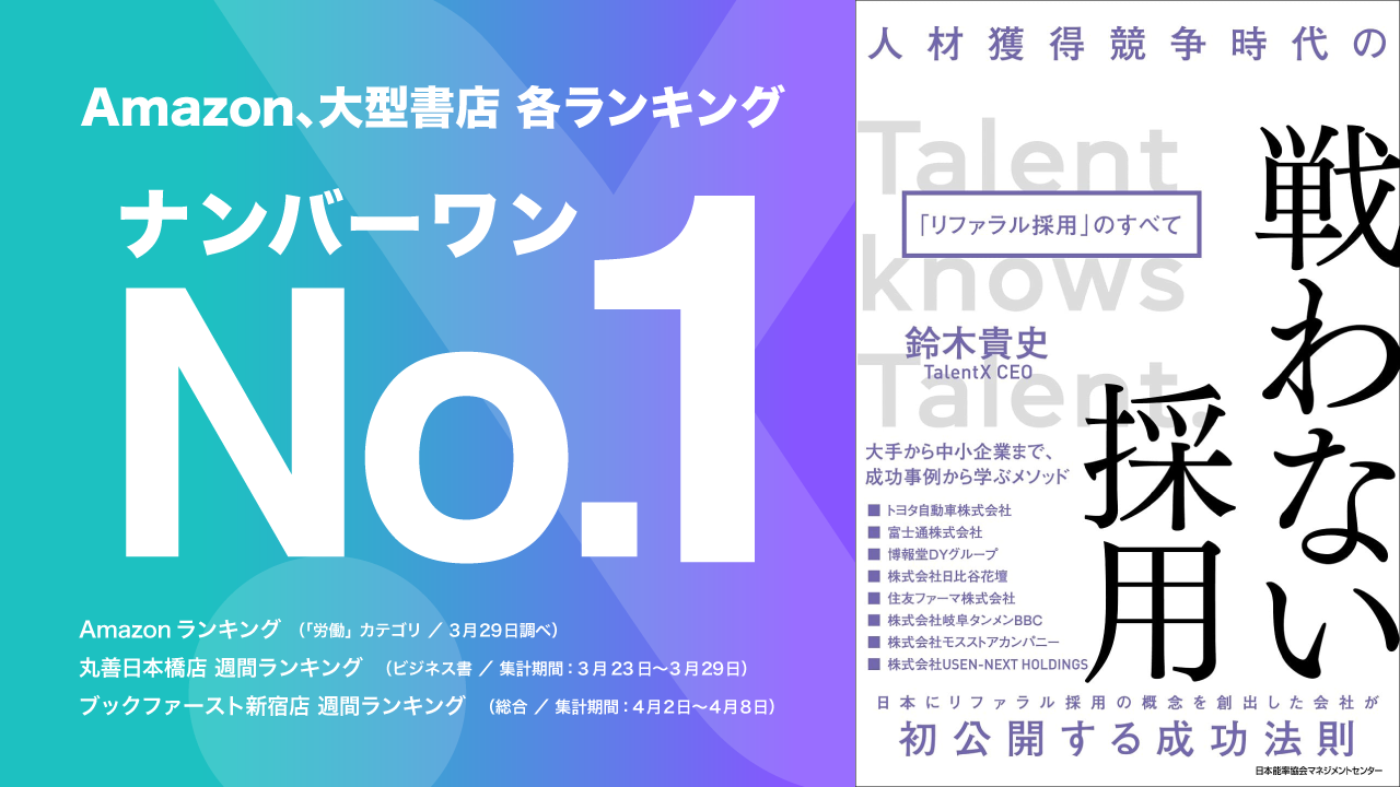 採用に関わるすべての採用担当者・経営者が“今”知っておくべき採用の潮流と戦わない採用を実現する「リファラル採用」のエッセンスが詰まった一冊です。3月26日(日)に発売して以来、Amazon、丸善・日本橋店、ブックファースト新宿店で週間販売ランキング1位を獲得しており、採用に課題を感じる人事担当者や経営者などから多くの共感をいただいています。
