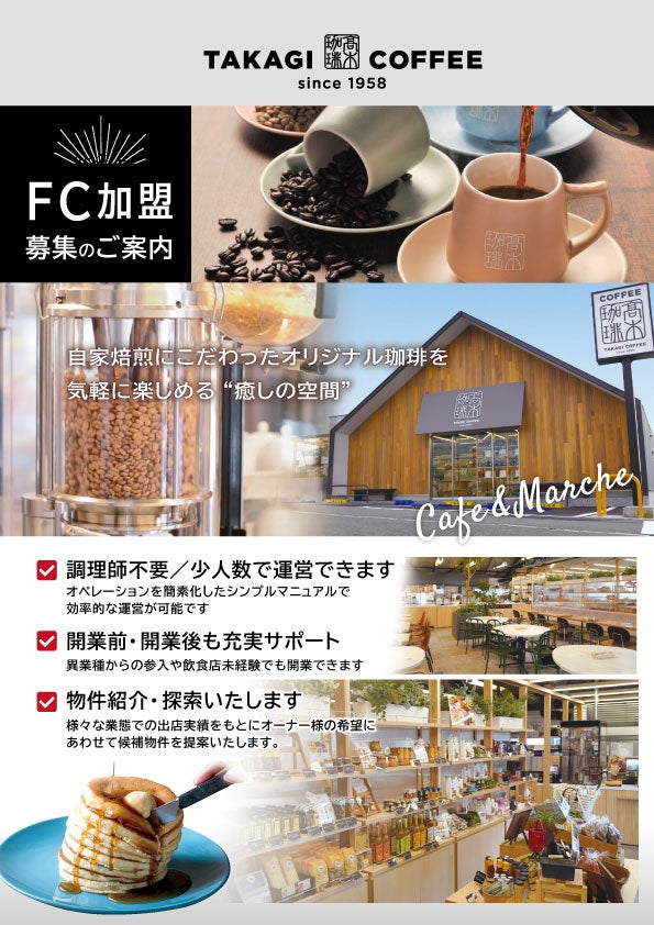 珈琲に向き合い世界中の産地農園から吟味したこだわりのコーヒーを、自信をもって自分の店で誇らしく提供できる、高木珈琲ブランドでは、パッケージ型のフランチャイズ店舗展開はいたしません。