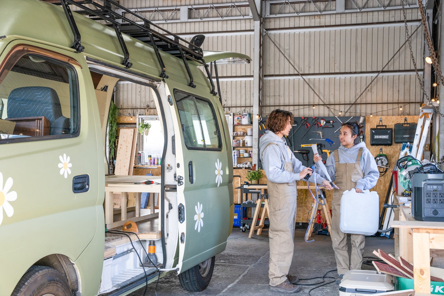 「ちゃんじろー夫婦」は「Mobi Lab.」を利用する前、月極駐車場で塗装などの作業をしていましたが、周囲への迷惑がなく、専用工具が揃い、バンライフに関する専門的なアドバイスを受けられ、バンライファーが集う「Mobi Lab.」の「シェアガレージ」の利用を決めたものです。
