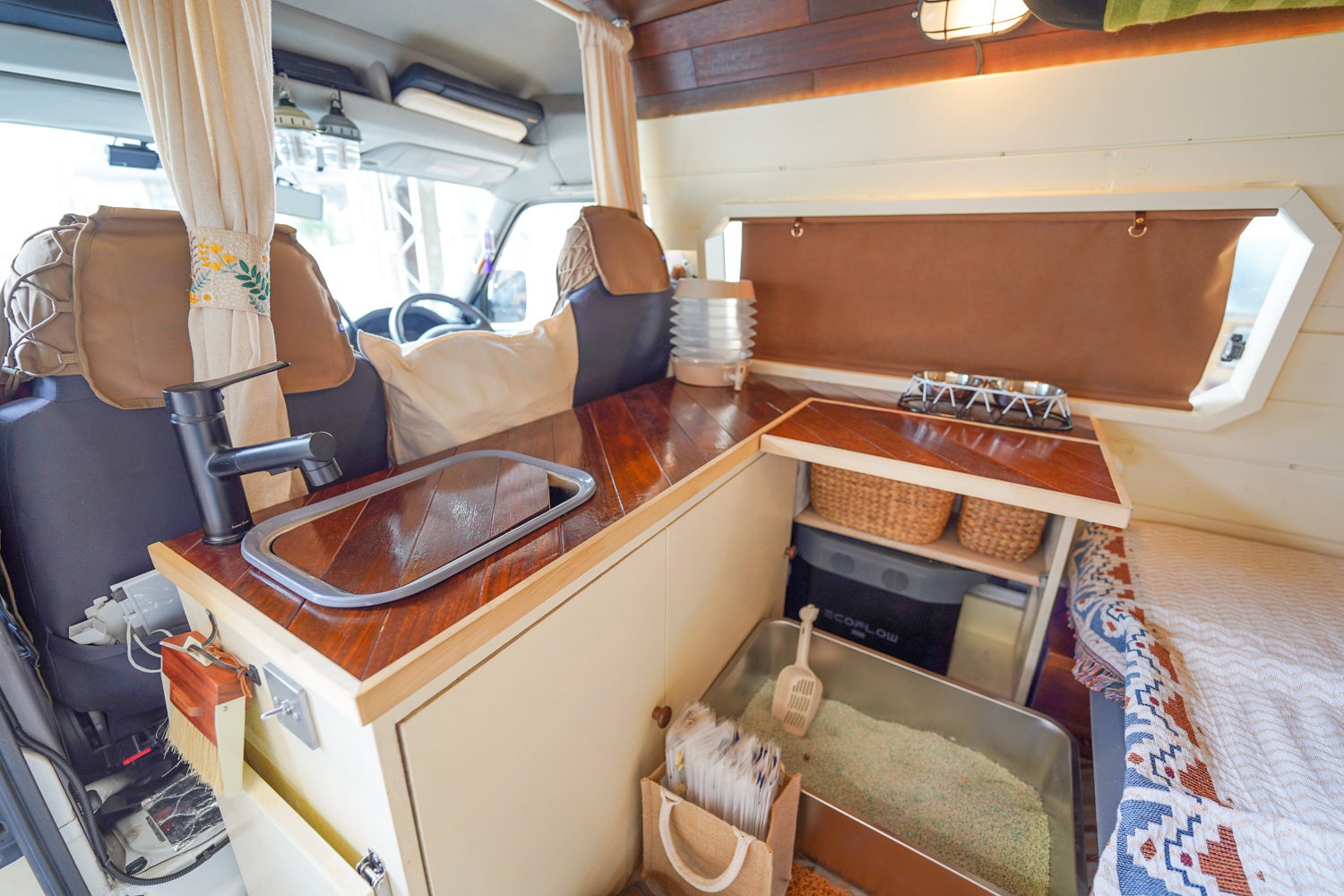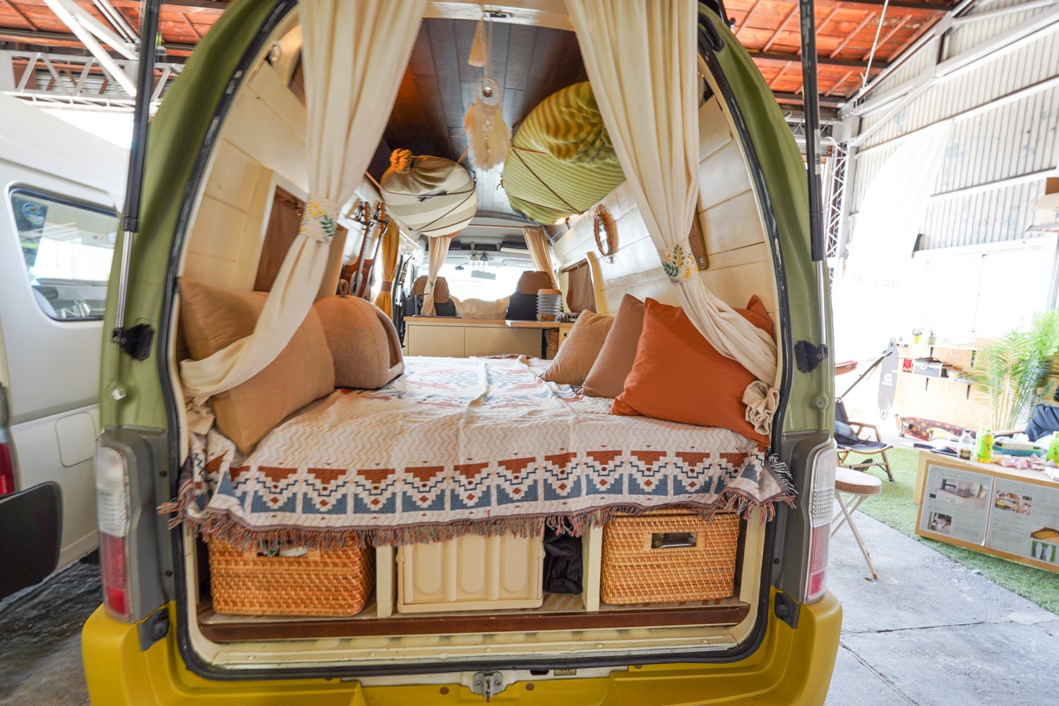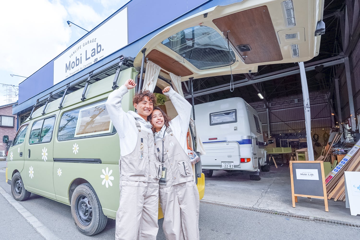 中西氏とチャン氏(両者現在24歳)は2021年、立命館アジア太平洋大学卒業後、中西氏は大阪で塾講師を務め、チャン氏は東京で美容部員として会社に勤務しました。両者の勤務日時が異なるため、お互い頻繁に会えない約1年の遠距離恋愛が続き、その間「好きな人と共に、好きな場所で、仕事含め好きなことをして過ごしたい」という想いが募り、2021年5月に両者でバンライフを実行することを決断し、同年11月に結婚しました。2022年11月、中古の日産キャラバンを64万円で購入、「二人でつくる世界」を心掛け、12月からキャラバンの塗装を開始し、2023年1月から3月末にかけて、「Mobi Lab.」にて車両内装の“動く家”キャンピングカー化を“DIY”で本格的に開始しました。