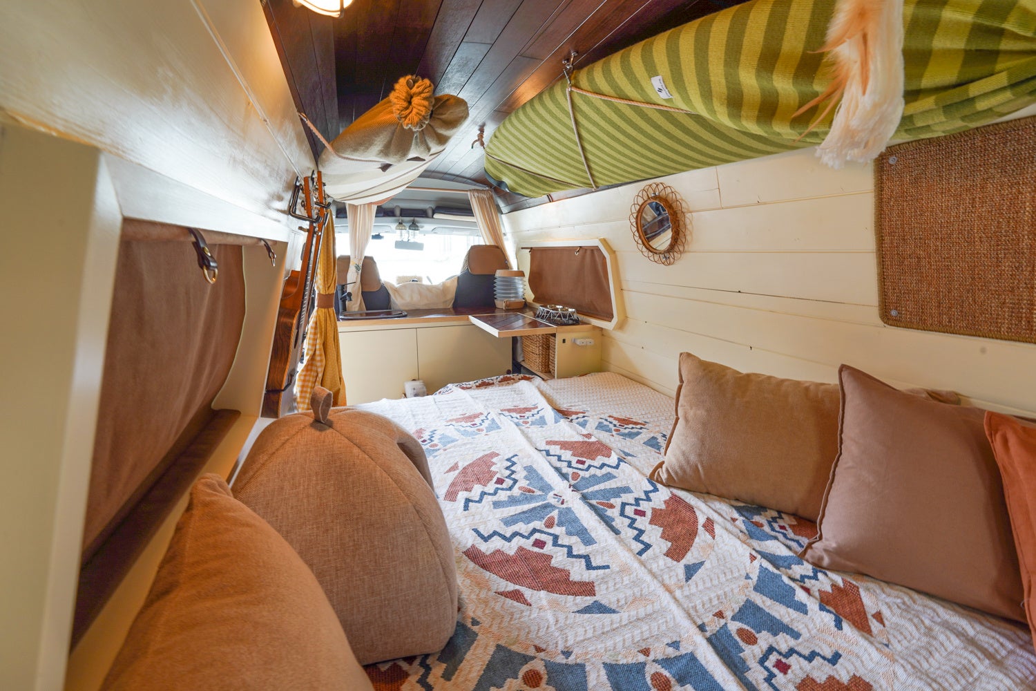【外装をミリタリーカラーに塗装。中西氏が大学時代に大分県でアルバイトした花屋での思い出と、旅先に「元気」「感動」などを届けたいという想いから、平和や希望の象徴でもあるキクの花柄模様をつけました。日産キャラバンの後部にはキッチンやベッドを、壁や天井は板張りに。屋根にはキャリアを載せてソーラーパネルを設置しました】