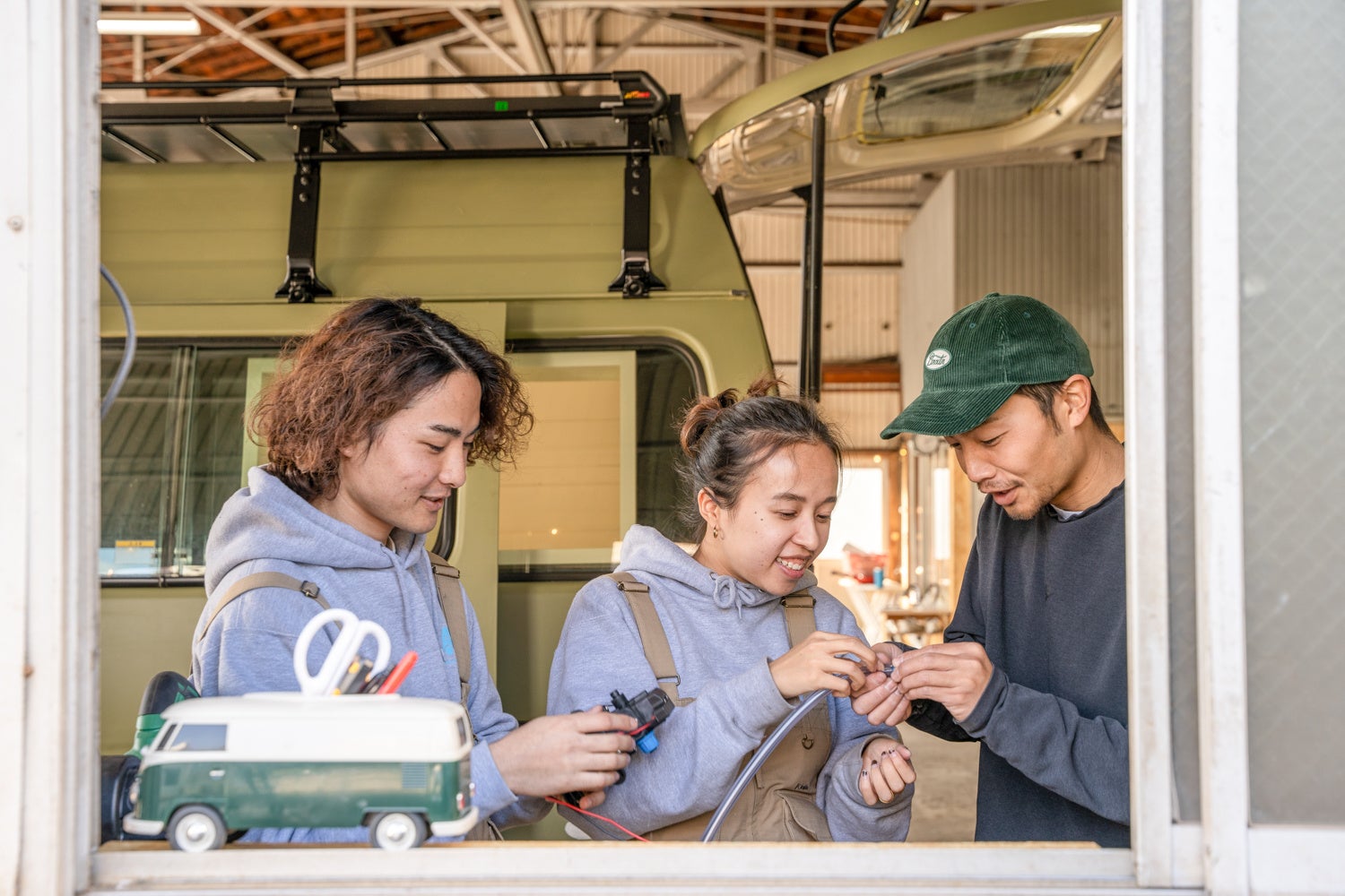 【「Mobi Lab.」で日産キャラバンE25を“動く家”としてキャンピングカーに改造している様子や電装系統に関して専門スタッフからアドバイスを受けている様子】