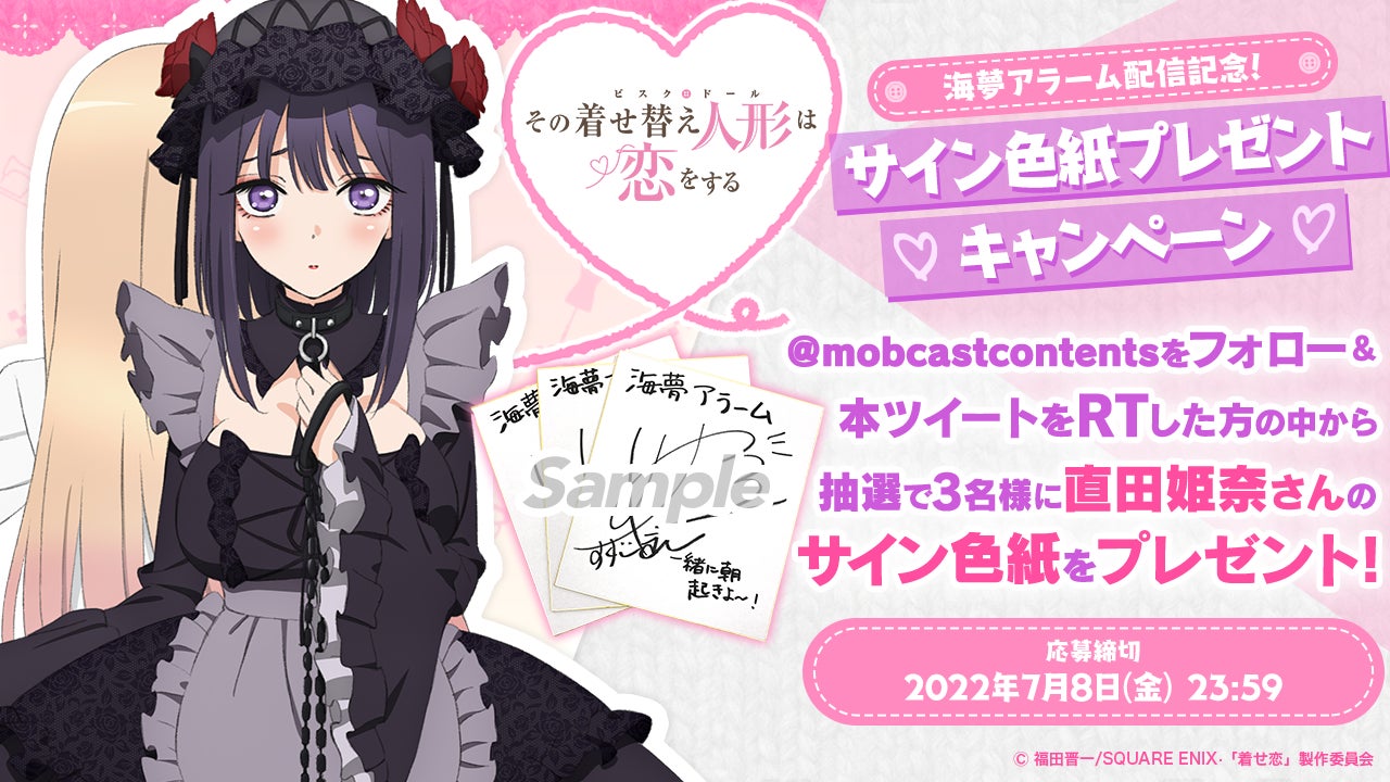 Twitterアカウント 『 @mobcastcontents 』 をフォローし、キャンペーンツイートをリツイートしていただいた方の中から抽選で3名様に、喜多川海夢役・直田姫奈さんのサイン入り色紙をプレゼント!皆様のたくさんのご応募お待ちしています。