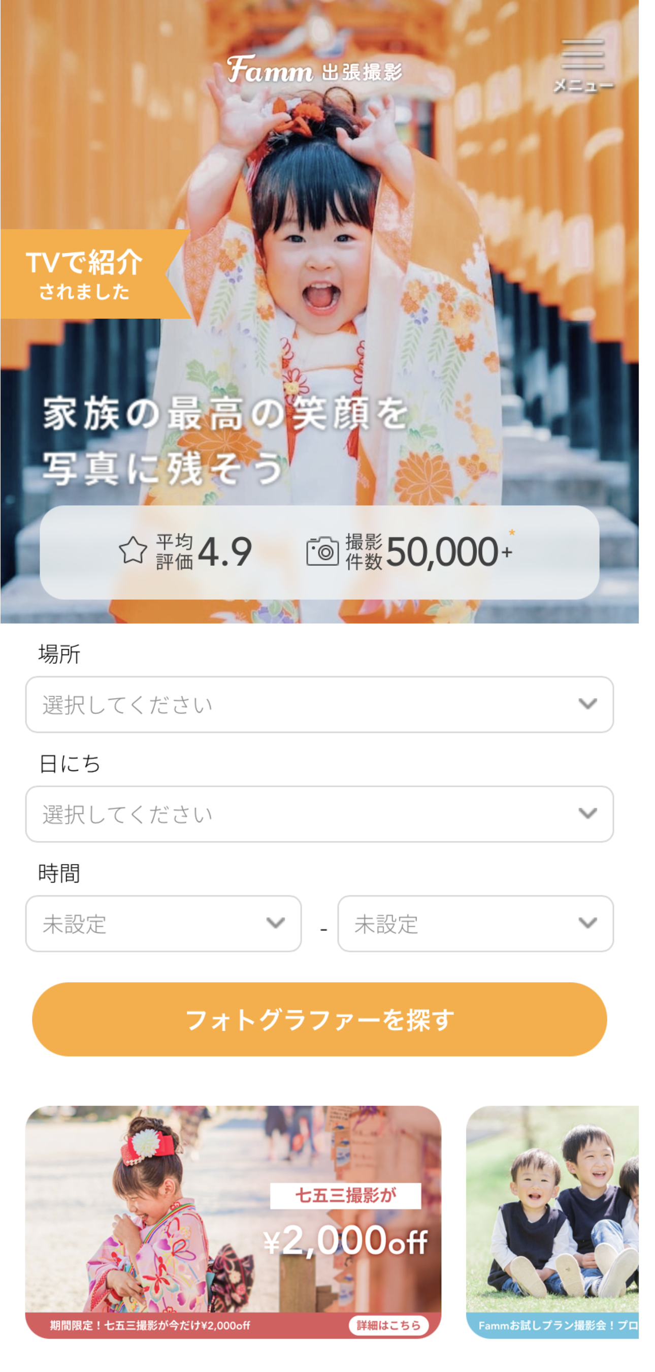 Famm出張撮影の登録フォトグラファーが500名を突破。七五三の出張撮影が¥2,000offになるキャンペーンも開始。