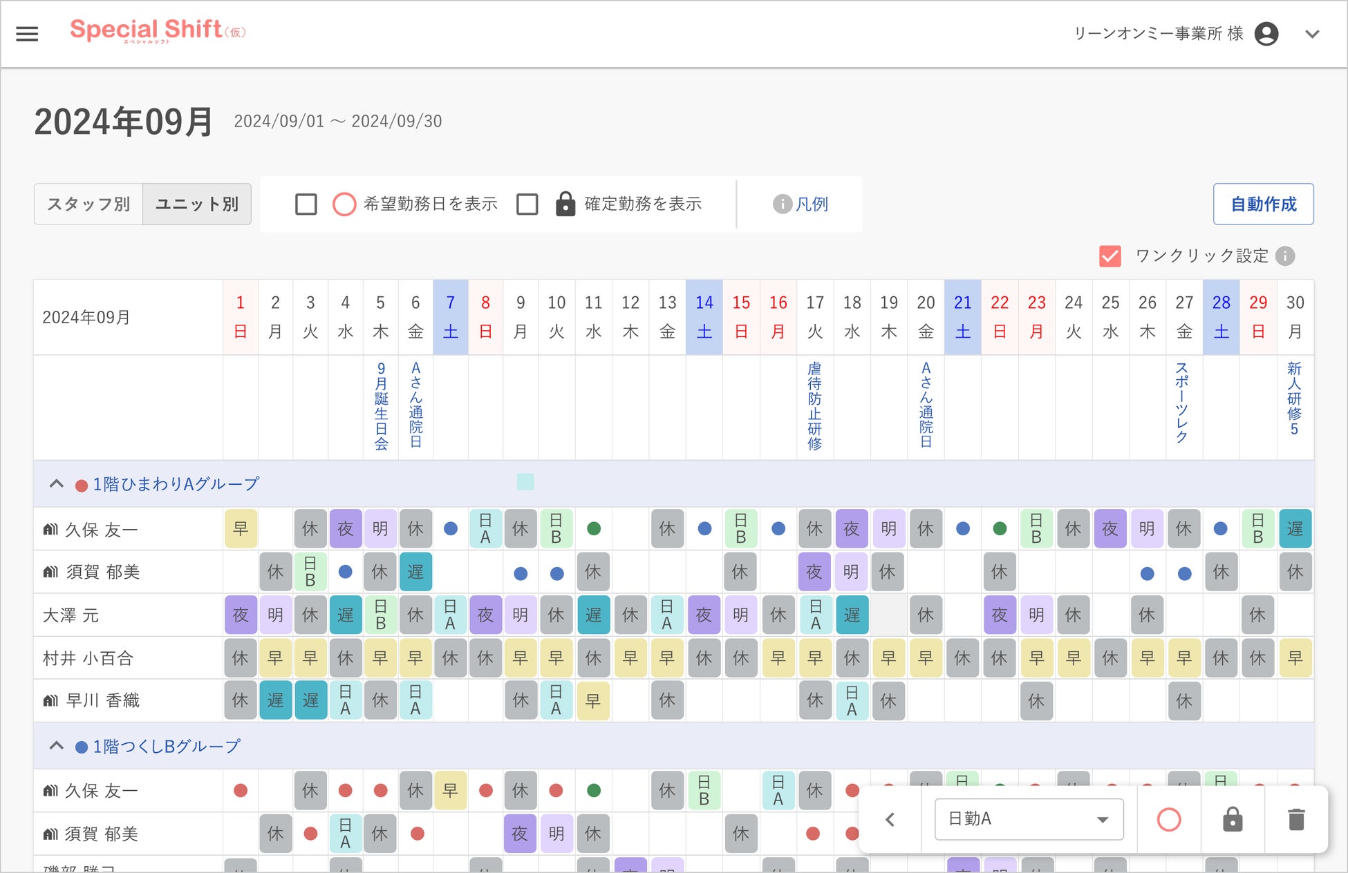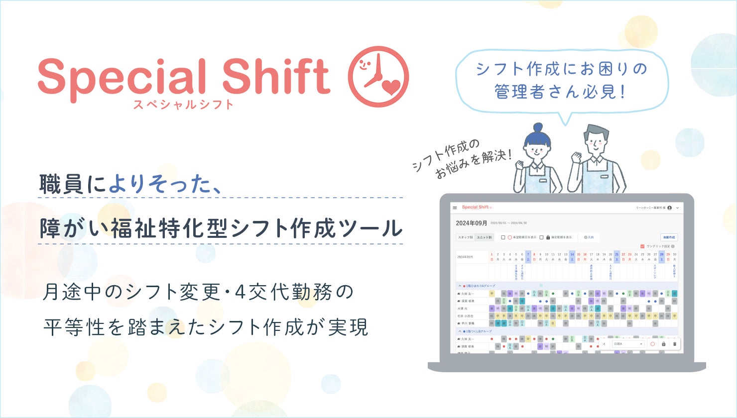株式会社Lean on Me(本社:大阪府高槻市、代表取締役:志村駿介、以下「リーンオンミー」)は2024年9月10日、障がい福祉サービス向けの勤務シフト作成ツール〈Special Shift〉を発売いたしました。シフトの作成・調整が管理者の大きな負担となっている現状を受け、急な欠勤や交代に伴う調整が簡単にできる仕組みを構築。4交代制やユニット制を考慮するなど、障がい福祉業界特有の事情にも対応しています。