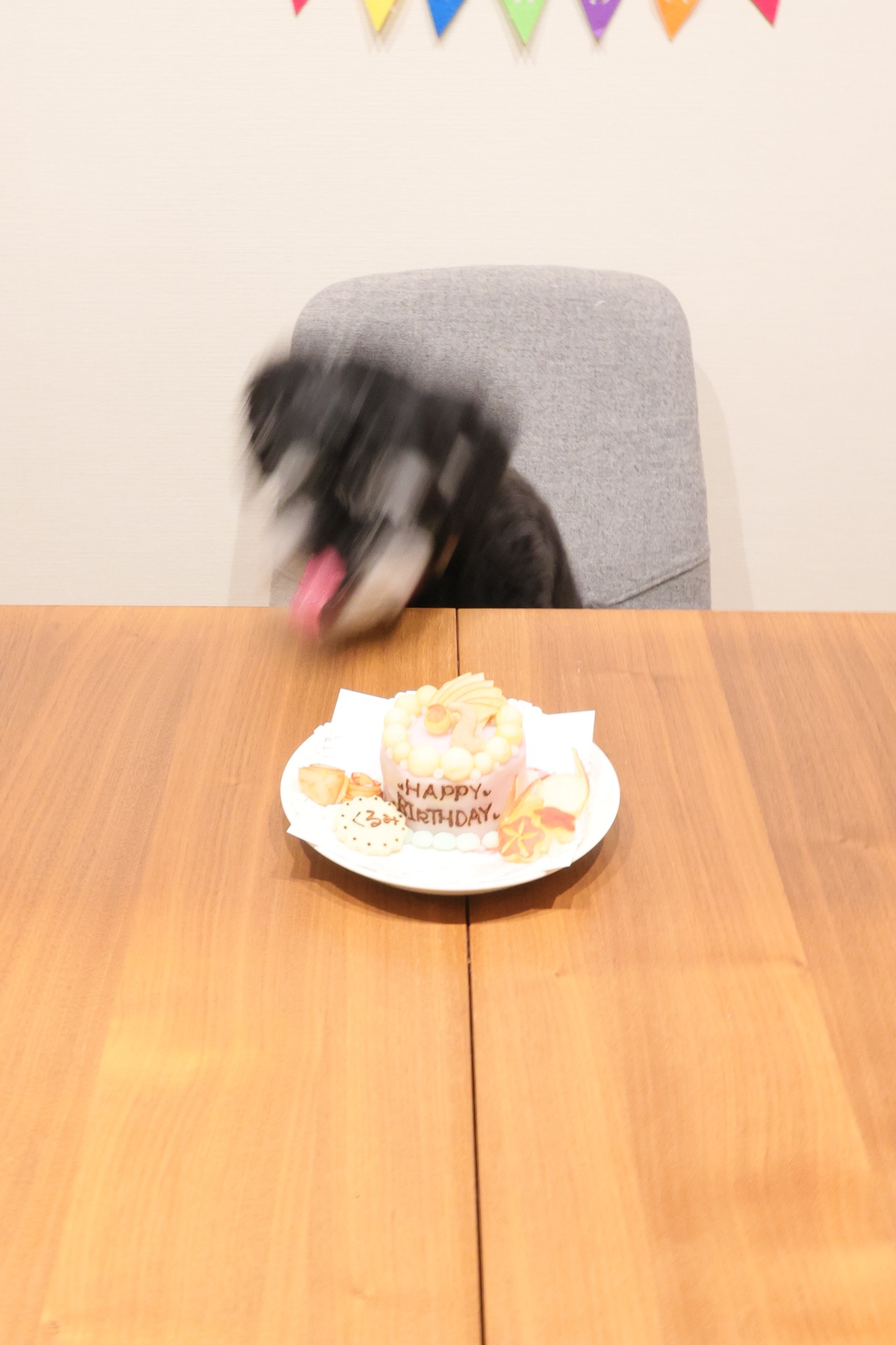 犬の誕生日なので、ケーキを買ってきました。「ペットにフラッシュはよくない」という、中途半端な知識。 せっかくなので、ケーキにも犬にもピントを合わせたい!絞り込むF値、上がるISO感度、伸びていくシャッタースピード!! 何枚か撮ってたんですが、我慢できなくなった犬が遂に・・・!
