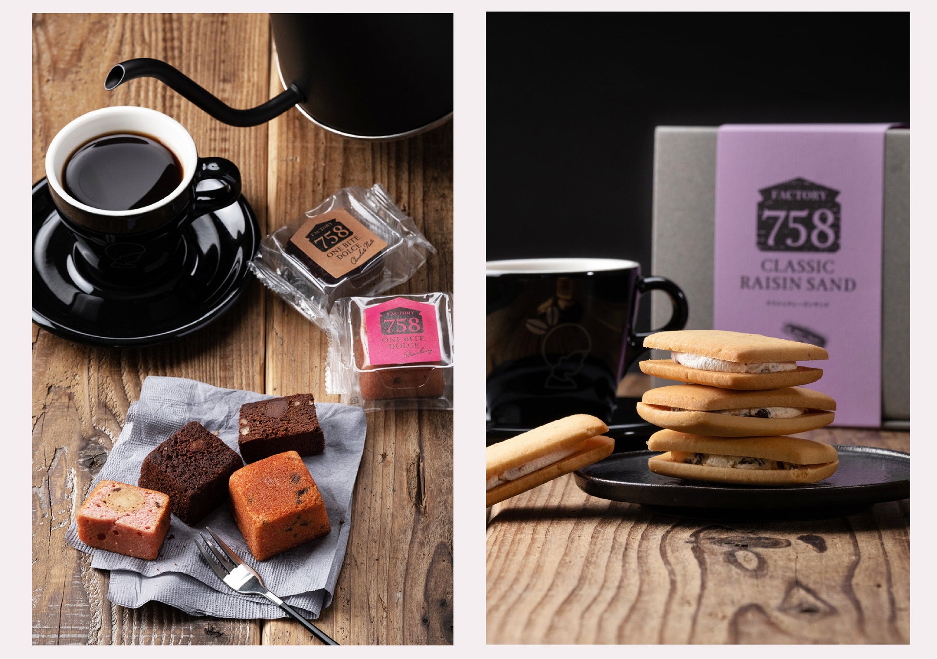 名古屋発のスイーツブランドFACTORY758より、コーヒーとの相性を追求した贅沢な焼き菓子「ワンバイトドルチェ」と「クラシックレーズンサンド」新発売