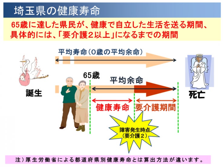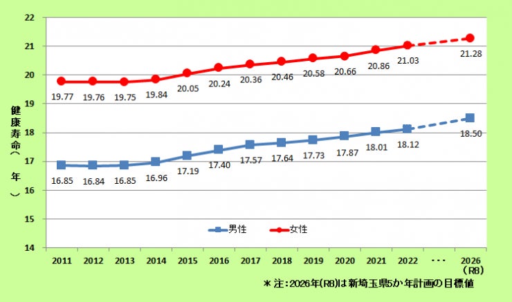 埼玉県では、65歳に達した県民が健康で自立した生活を送ることができる期間、具体的には、介護保険制度の「要介護2以上」になるまでの期間を「健康寿命」として算出し、健康寿命の目標値(令和8年:男性18.50年、女性21.28年)を設定しています。