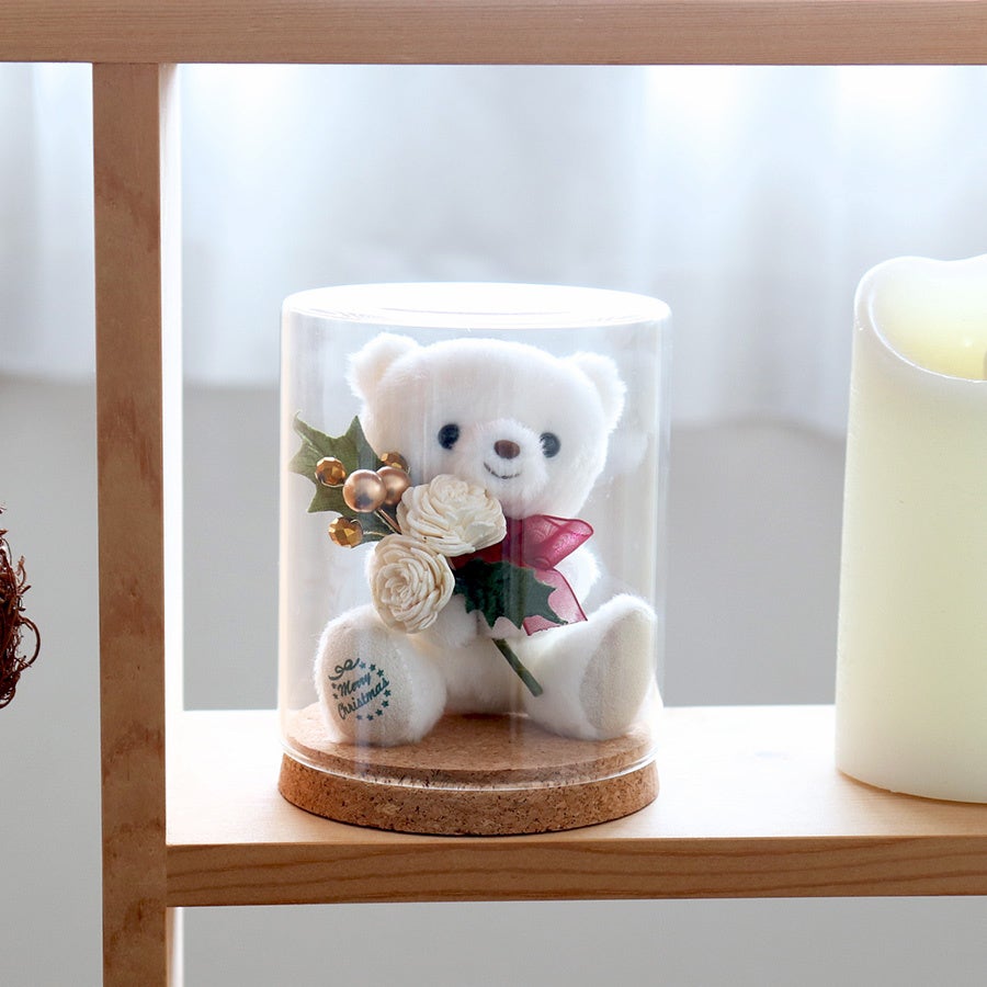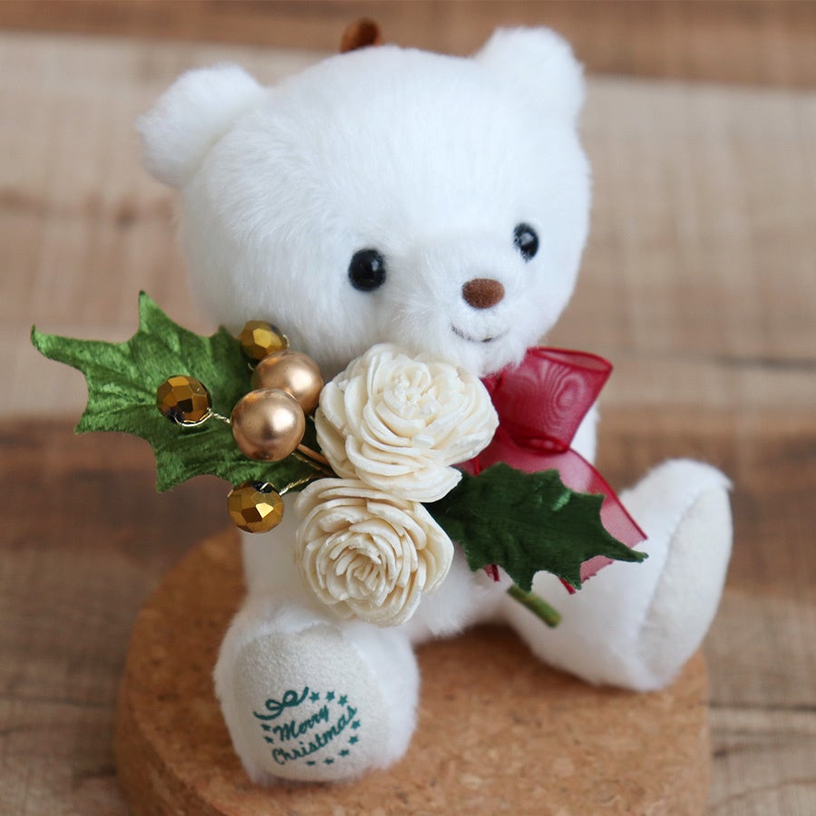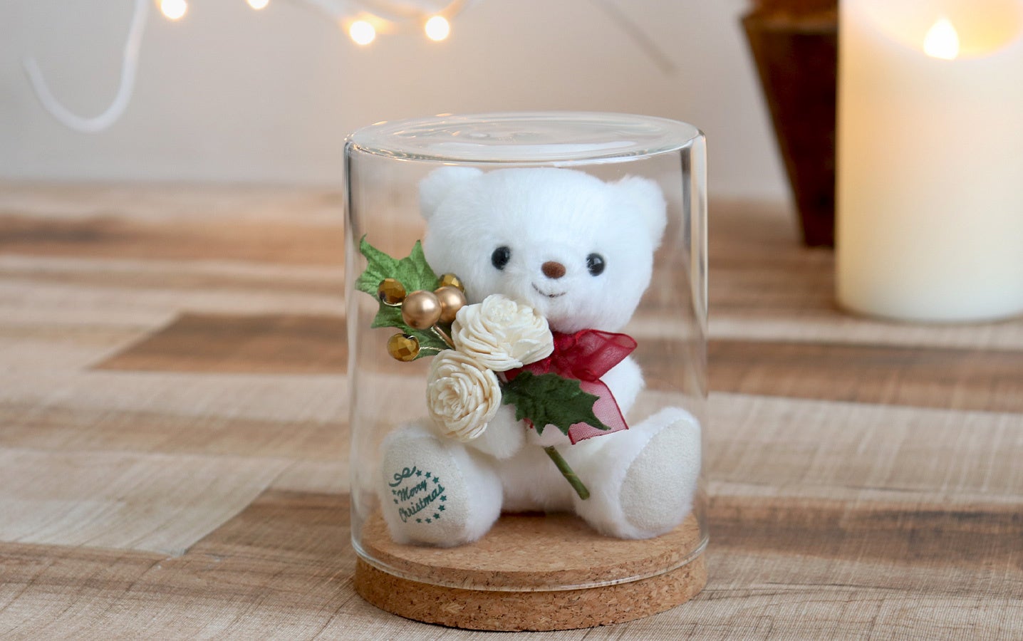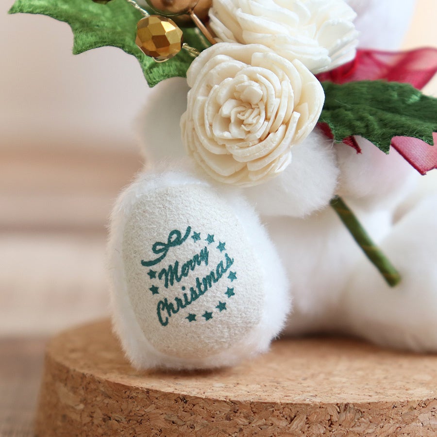 クリスマスシーズンより新登場の雪のように真っ白な「teteホワイト」が、小さなクリスマスブーケを抱いた温もりあふれるデザイン。右足裏にはオリジナルのリースアイコンをプリントし、季節感を演出。ガラスドームに収められた姿は、飾って楽しめるインテリアギフトとしても人気です。