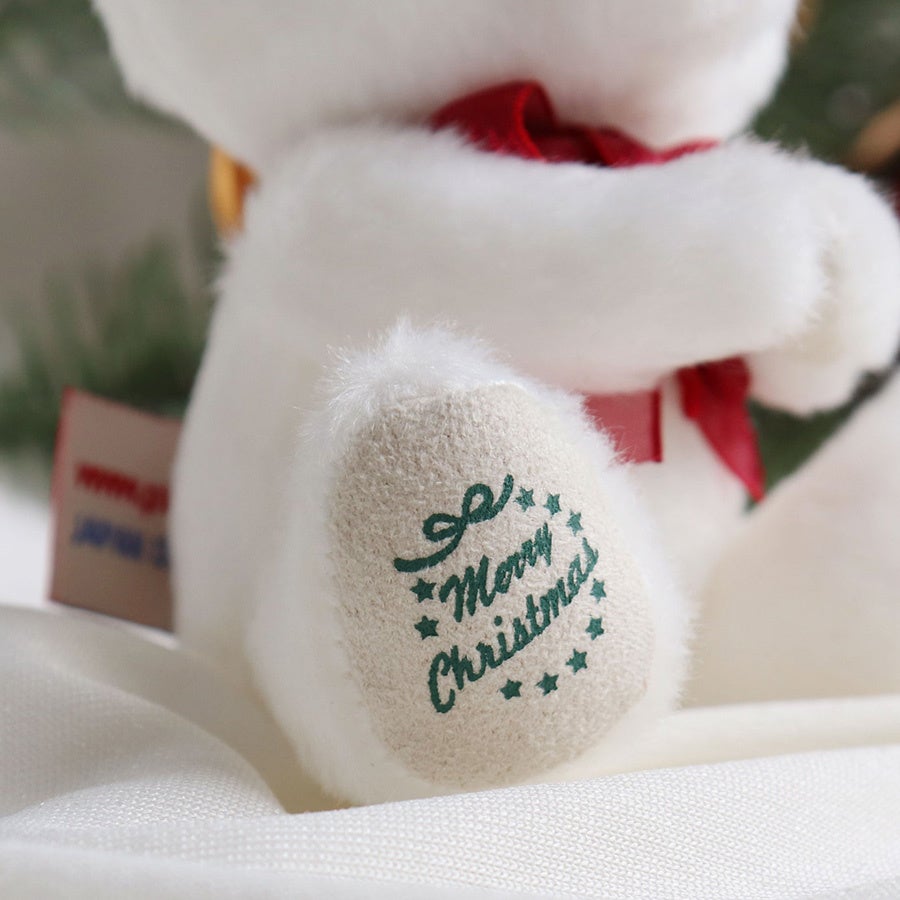 真っ赤なサンタマフラーを巻いたテディベア。クリスマスツリーと「Merry Christmas」のメッセージがプリントで入っています。