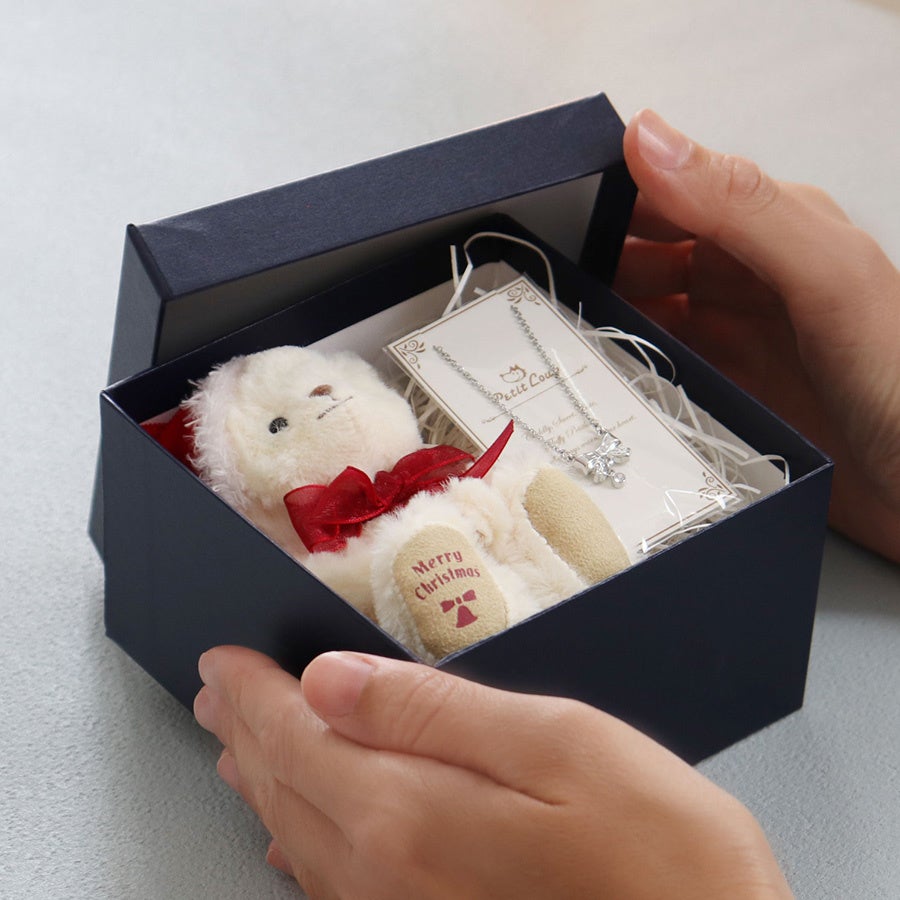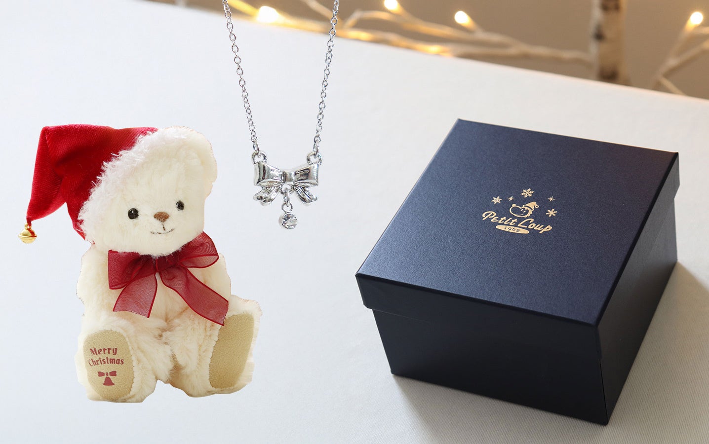 一粒クリスタルが輝くリボンモチーフのネックレスを添え、可愛らしさとエレガンスを兼ね備えたギフトに仕上げました。クリスマス限定ロゴを箔押しした特製ギフトBOX入り。