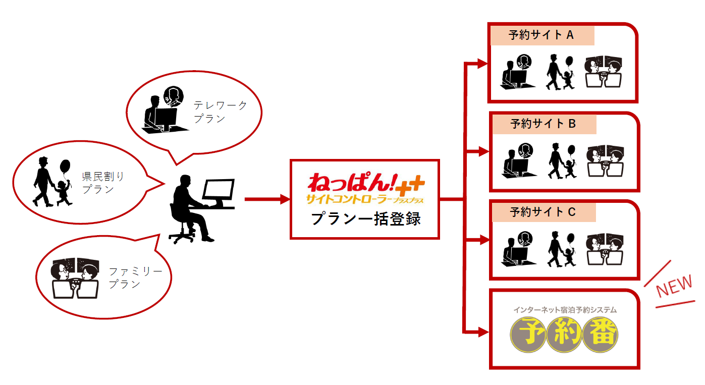 宿泊施設では、インバウンド旅行者の増加や旅行需要の回復に伴い、新しい宿泊プランを登録する機会が増加しています。「ねっぱん!サイトコントローラー++」では、主要機能の一つとして新しい宿泊プランを作成すると複数の予約サイトに一括でプランが登録できる「プラン一括登録」機能があります。今回の連携により、「ねっぱん!サイトコントローラー++」と「予約番」を利用している宿泊施設は、さらなる業務の効率化を図ることができます。