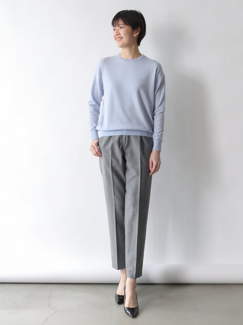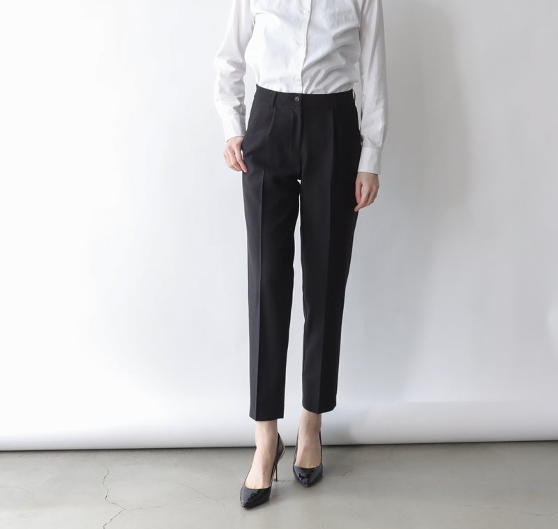 ヒップやもも周りにはゆとりを持たせ、膝下から裾にかけて緩やかに細くなるテーパードシルエットは、気になる足のラインを隠しながら足首を華奢に、ほっそりと見せてくれます。