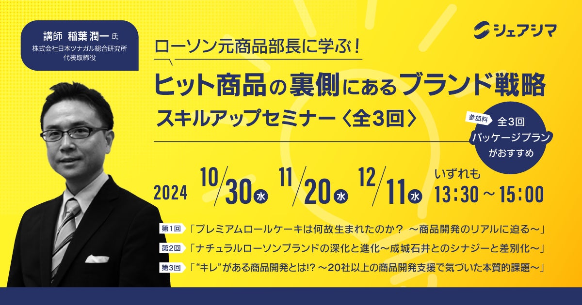 このたび、ローソンの「プレミアムロールケーキ」やナチュラルローソンのリ・ブランディングに携わり、業界で多くの成功事例を持つ、株式会社日本ツナガル総合研究所 稲葉潤一氏をお迎えし、10月30日から全3回のシェアシマ・スキルアップセミナ―を開催することにいたしました。