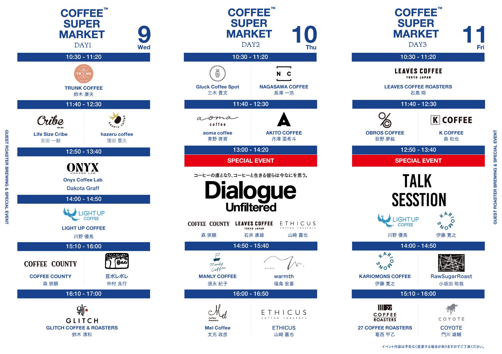 2日目は「Dialogue Unfiltered」をテーマに、COFFEE COUNTY 森氏、ETHICUS coffee roasters 山崎氏、LEAVES COFFEE ROASTERS 石井氏の3名をお迎えしてトークセッションを実施。この3名がテーマに合わせて焙煎したコーヒー豆セットも数量限定で販売いたします。