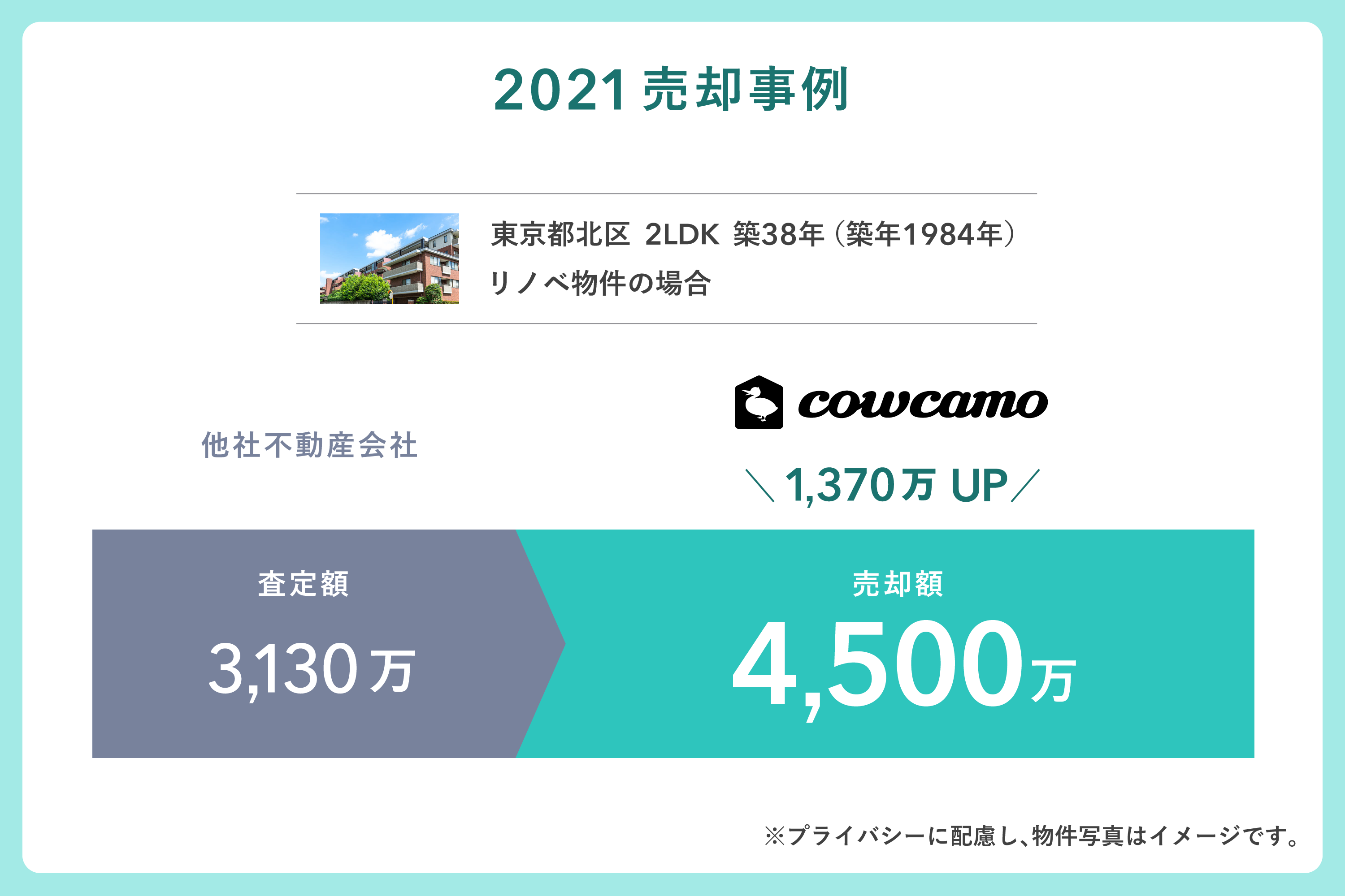 2021年に個人のお客様からお預かりしたリノベーション済マンションの売却事例では、他社の査定ではリノベーションの価値が査定額に反映されなかったためカウカモに相談をいただき、カウカモの査定ではリノベーションの価値を適切に評価した上で、売却に成功した例もあります。結果的に、最初の査定に比べて1,000万以上高く、買主を見つけられたことになります。