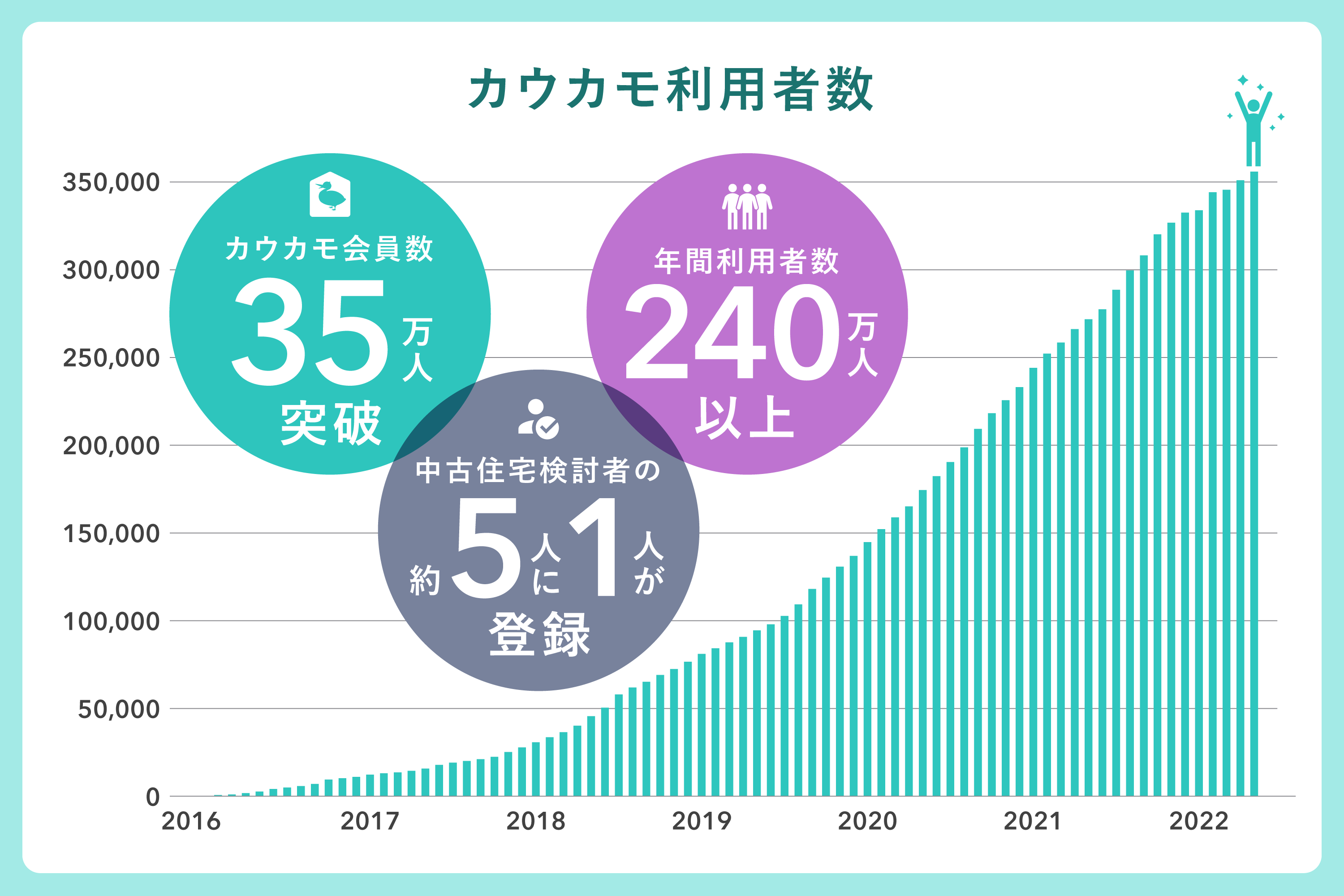 その掲載情報に魅力を感じて集まった会員登録ユーザーは35万人以上(2022年4月末実績)となり、会員登録をせずに情報を閲覧している方を含めると利用者数は年間240万人以上(2021年5月1日~2022年4月末実績)で、その登録者数・利用者数は年々増加しています。カウカモの物件掲載メディアに主に情報掲載している東京都区部~横浜の一部エリアにおいては、中古住宅購入検討者の約5人に1人が登録しています(※)。