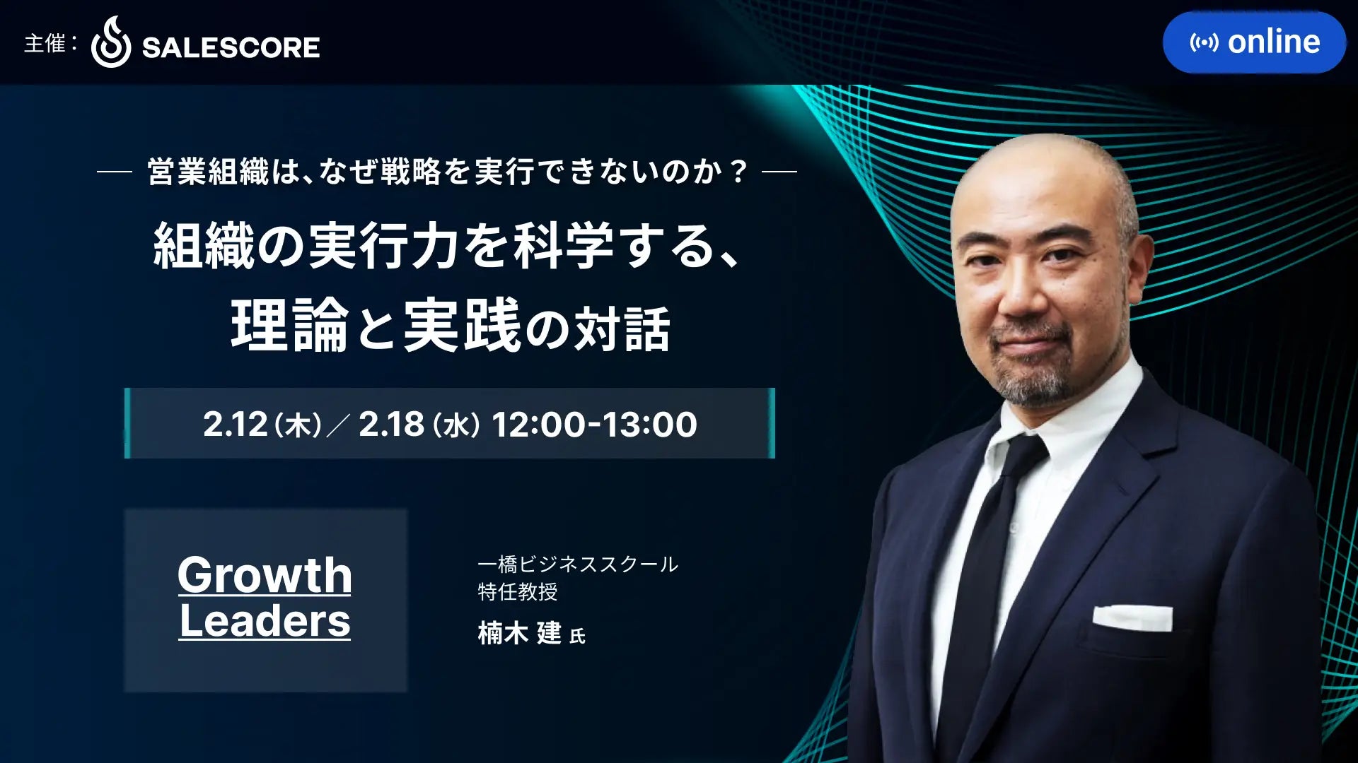 「達成の喜びをあたり前に」をビジョンに掲げるSALESCORE株式会社(本社:東京都渋谷区、代表取締役:中内 崇人、以下:当社)は、営業変革に挑むリーダーに実践的な学びの場を提供する番組型ウェビナー『Growth Leaders』の第5回を開催いたします。今回はゲストに、一橋ビジネススクール 特任教授の 楠木 建 氏を迎え、当社代表の中内も登壇。楠木氏が提唱する「ストーリーとしての競争戦略」という経営学の視点と、当社が営業現場の支援を通じて体系化してきた「営業実行学」を掛け合わせ、営業戦略を描き、SFAやDXを導入し、施策を打ってもなお、現場が動かず成果につながらないのはなぜなのかという問いに向き合います。
