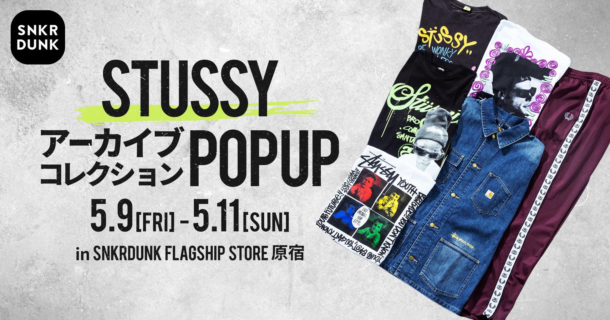 キャンペーン期間中の2025年5月9日(金)〜5月11日(日)の3日間、STUSSYの歴史が詰まった名作コレクションを集めたポップアップ「STUSSY ARCHIVE COLLECTION(ステューシー アーカイブコレクション)」を、スニダン FLAGSHIP STORE(HARAJUKU)にて開催いたします。期間中、STUSSY ARCHIVEに情熱を注ぐコレクター・アベヒロユキ氏をはじめ、古着を知り尽くしたショップスタッフがスニダン FLAGSHIP STORE(HARAJUKU)にて接客をおこない、着こなし提案はもちろん、アーカイブ品の歴史や魅力を知っていただくことができます。