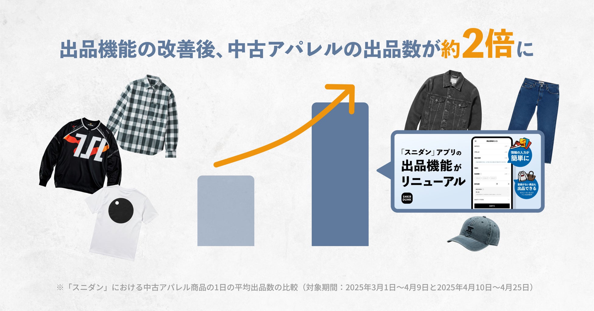 スニダンでは、お客さまから出品機能改善へのニーズがあったこと、アパレルの取り扱いジャンルを拡大し幅広い商品をお客さまに提供していきたいと考えていたことから、2025年4月に出品機能のリニューアルを実施しました(※1)。スニダンに登録がない商品も出品が可能になり、特に中古商品の出品がこれまで以上にかんたんになりました。本機能改善により、改善後は中古アパレルにおける1日の平均出品数が約2倍(※2)となり、スニダンで中古商品の出品を楽しむお客さまが増えています。こうした背景を踏まえ、より多くのお客さまにスニダンで中古アパレル商品を「売ること」「買うこと」を楽しんでいただきたいと考え、本キャンペーンの開催を決定いたしました。