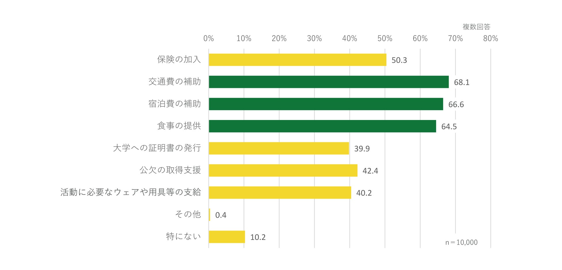 必要だと思うボランティアサポートの内容について、最も高いのは「交通費の補助」68.1%、次いで「宿泊費の補助」66.6%、「食事の提供」64.5%だった。交通費、宿泊費の補助、食事の提供へのニーズが高いことがわかった。