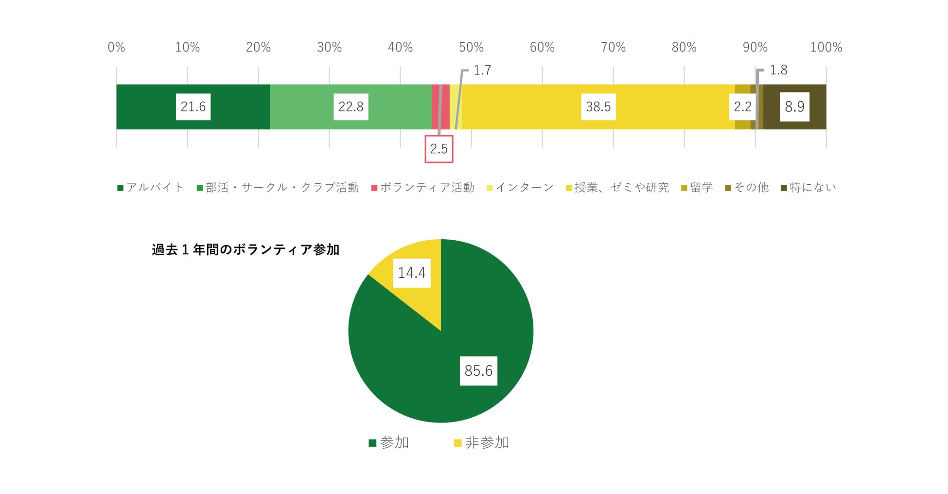 学生時代に力を入れていること/入れたこと(ガクチカ)として「ボランティア」を選択した学生は2.5%だったが、そのうち85.6%が過去1年間にボランティア活動に参加していた。