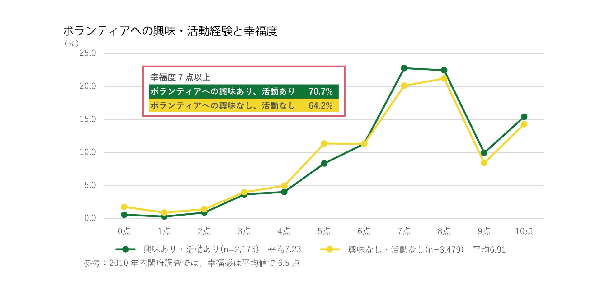 幸福度についての調査で7点以上をつけた割合が「ボランティアへの興味あり、活動あり」では70.7%に対し、「ボランティアへの興味なし、活動なし」では64.2%で、ボランティアへの興味や参加経験があるほど、幸福度が高い傾向にあることが明らかになった。