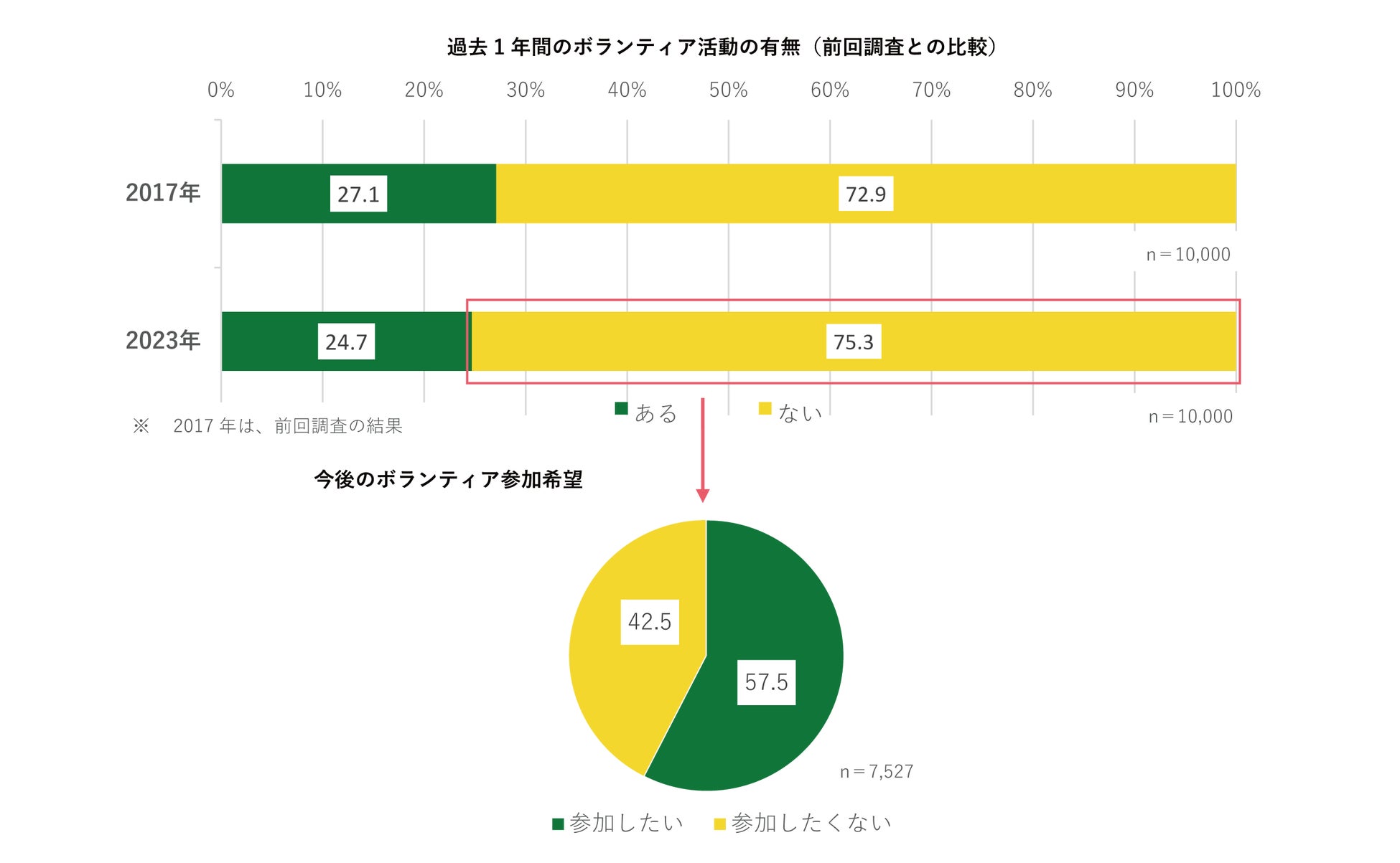 また、過去1年間にボランティアに参加しなかった学生75.3%のうち、57.5%がボランティア活動への参加を希望しており、活動に参加していない学生も半数以上が参加を希望していることがわかった。