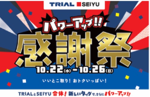 株式会社トライアルホールディングス(本社:福岡県福岡市、代表取締役:永田 洋幸)の傘下の株式会社トライアルカンパニーと株式会社西友は、10月22日(水)~10月26日(日)の期間、トライアルグループ恒例の「感謝祭」を開催、西友も初参加いたします。