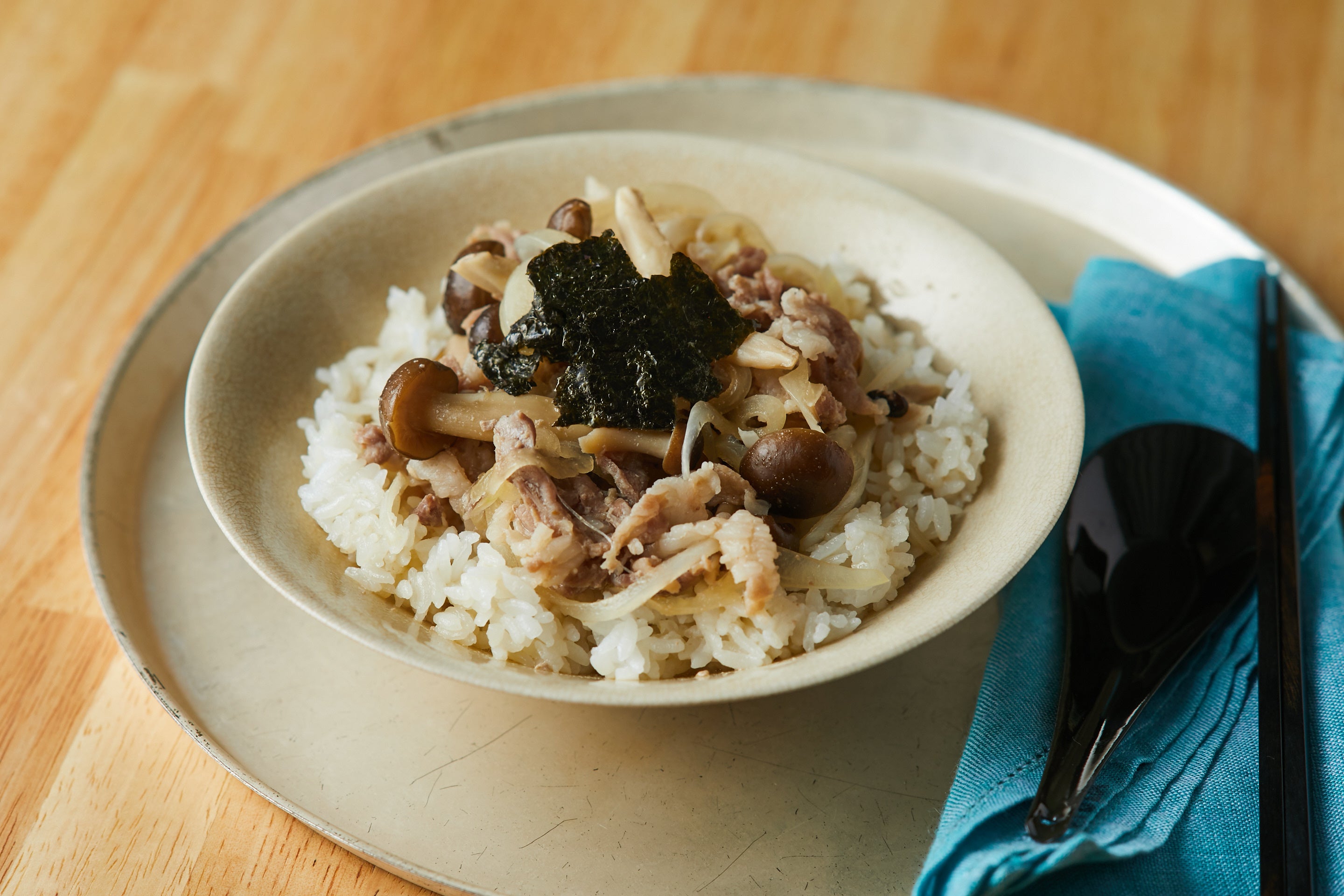 味付けはめんつゆだけでも十分ですが、砂糖を加えることでよりコクが増します。なんと一品で野菜ときのこが100gもとれる、バランスも考えられた豚丼です。