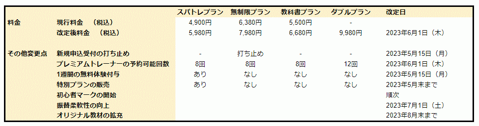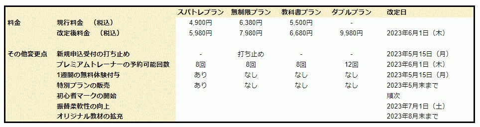 スパトレ、プラン改定のお知らせ