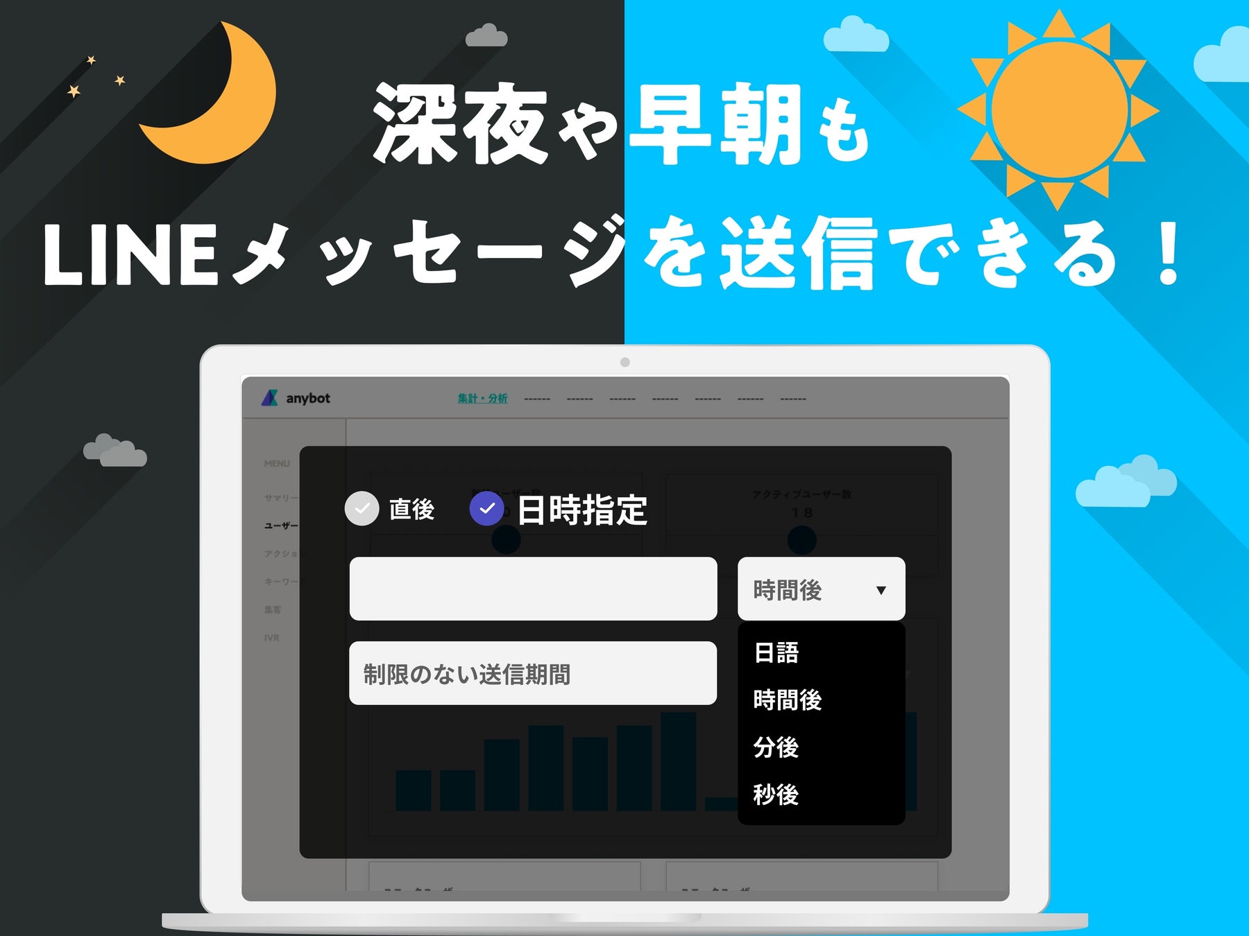 エボラニ株式会社が提供する「anybot」を導入すると、LINE公式アカウント内で友だちの行動に応じたメッセージを自動で配信できます。従来は深夜・早朝には配信できませんでしたが、ビジネスやお客さまの生活様式に合わせてきめ細かく配信時間を調整できるように改善いたしました。最適のタイミングで友だちにメッセージを送り、エンゲージメント(親密度)を高めるのにお役立てください。