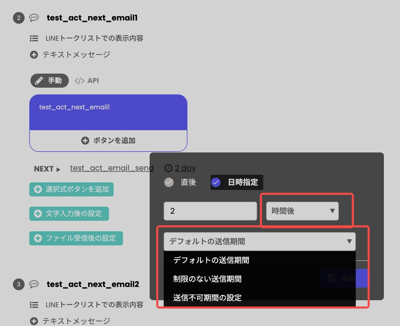 「日後」「時間後」を選択した場合は、以下の3パターンから選んでいただけます(「分後」「秒後」の場合は設定できません)。