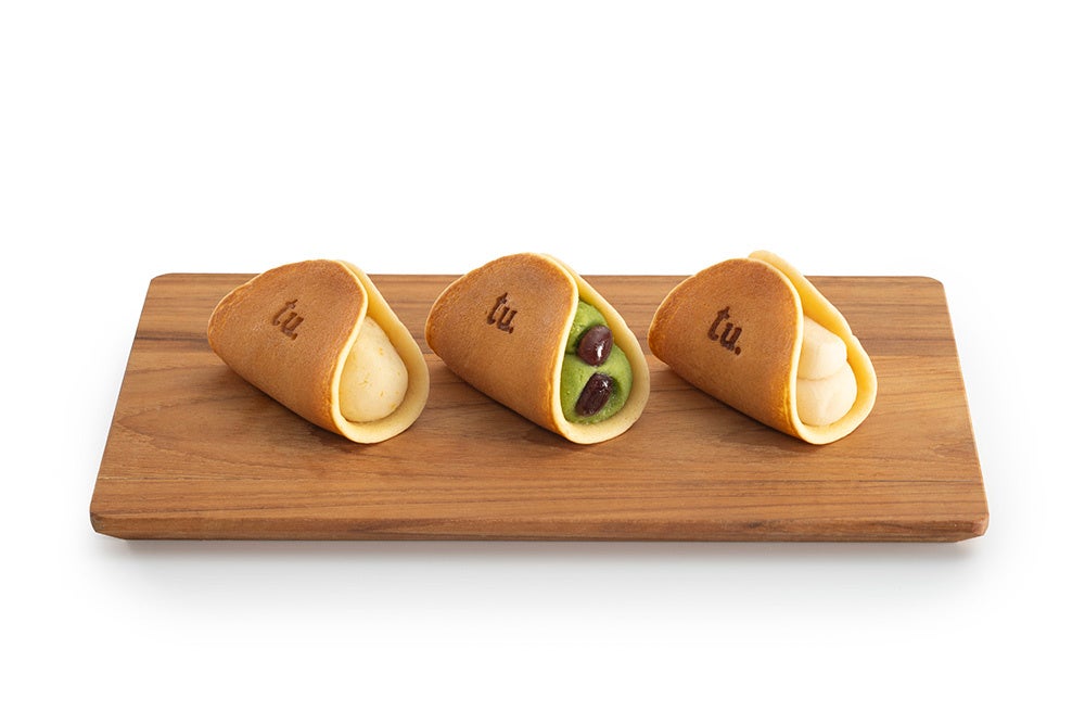 鶴屋吉信のベストセラー焼菓子「つばらつばら」をアレンジし、工場直送“ふわもち”食感の焼皮に白あん×マスカルポーネチーズを独自にブレンドした「マスカルポーネあん」をたっぷりと包んだ「生つばら」。IRODORIでは東京店と同じく、クリーミーで軽やかな味わいと素材をあわせた「プレーンバニラ」「抹茶」「柚子」の3つの風味をご提供いたします。
