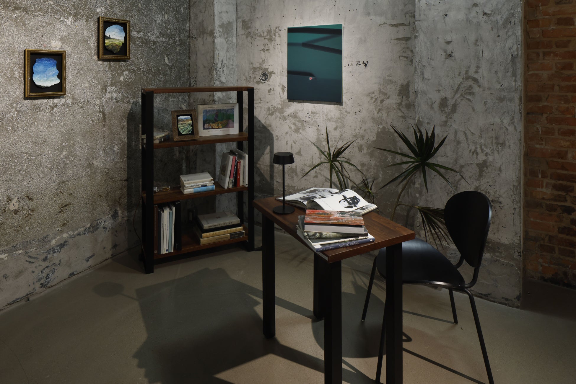 片寄さんのプライベート空間を再現した書斎スペースの家具に、KANADEMONOのコンパクトデスクやシェルフなどのアイテムが使用されました。カスタマイズ可能な「THEシリーズ」より、高級感のある無垢 ウォルナットとブラックアイアンの組み合わせのアイテムをセレクト。滑らかで美しい木目を、マットなブラックアイアンがすっきりとスタイリッシュにまとめ上げています。