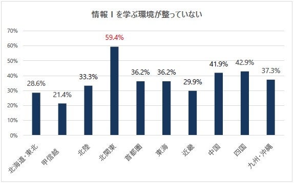 各地域において、情報Ⅰに対する取り組みは進んでいるものの、エリア問わず、多くの教員が対策や学ぶ環境を十分に提供できていないと考えていることが伺えます。