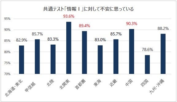 共通テスト「情報Ⅰ」への調査結果として、不安に思っている割合が最も多かったのは北関東エリア(茨城・栃木・群馬)の93.6%で、続いて中国エリア(鳥取、島根、岡山、広島、山口)の90.3%、首都圏エリア(東京・神奈川・千葉・埼玉)の89.4%と続きました。一方で、最も低い割合である四国エリア(徳島、香川、愛媛、高知)についても約8割が不安に思っていると回答していることから、全体的にみて学校現場では「情報Ⅰ」の対策について試行錯誤が続いていることが伺えます。