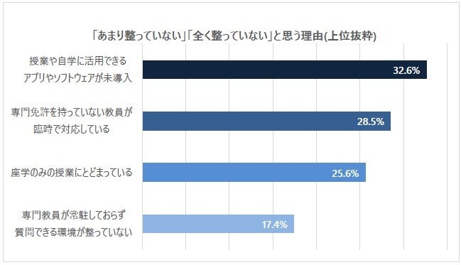 特に、生徒が自学に活用できるようなアプリやソフトウェアを導入できていないことや、教員不足により専門免許を持っていない教員が臨時で対応していることなどを理由に挙げる回答が目立ちました。
